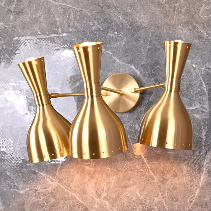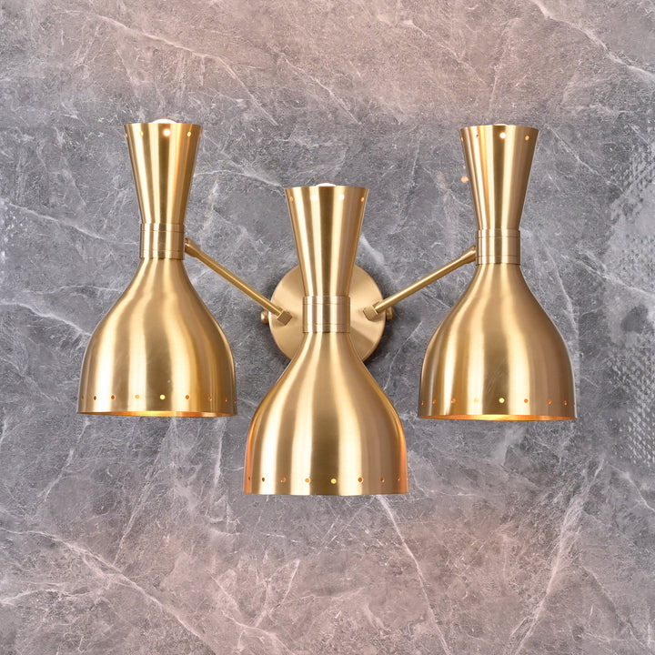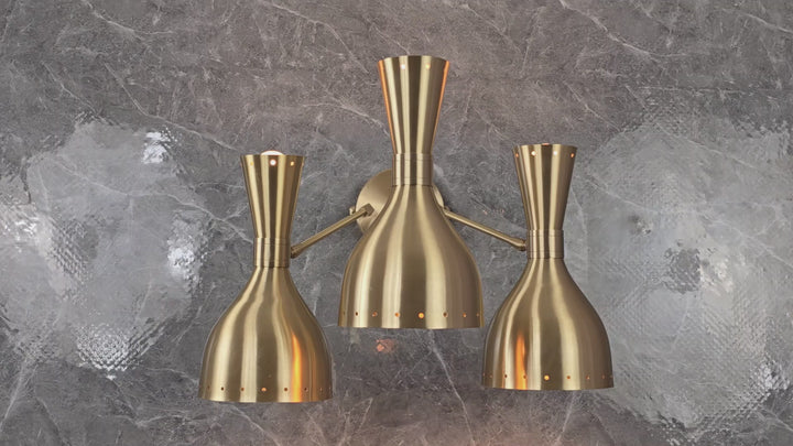 Striking a perfect balance between retro charm and contemporary finesse, this triple cone wall sconce is a masterclass in mid-century modern design. Crafted from brass and finished in a soft brushed gold, the fixture features three symmetrical conical shades extending across a 21-inch span and rising to a height of 11 inches. Its precisely perforated shades softly filter light, casting a warm, golden glow while adding texture and rhythm to the design. The clean geometry and warm metallic tones make this sconce a timeless choice, whether flanking a vanity mirror, accentuating a hallway, or adding vintage sophistication to commercial interiors. With its refined silhouette and thoughtful detailing, it effortlessly elevates any space.