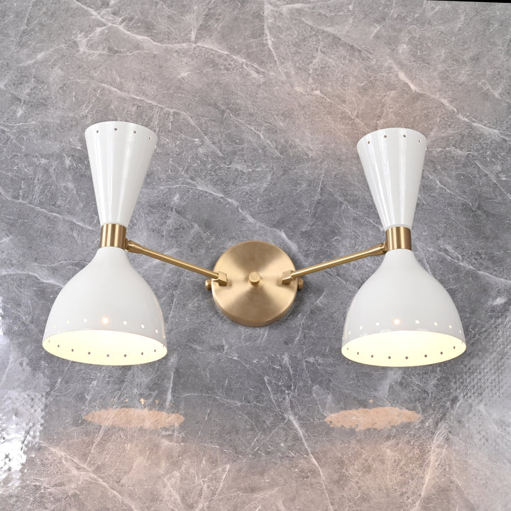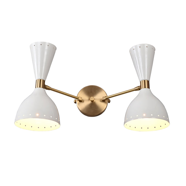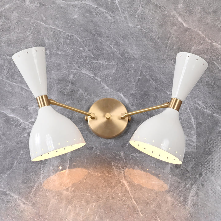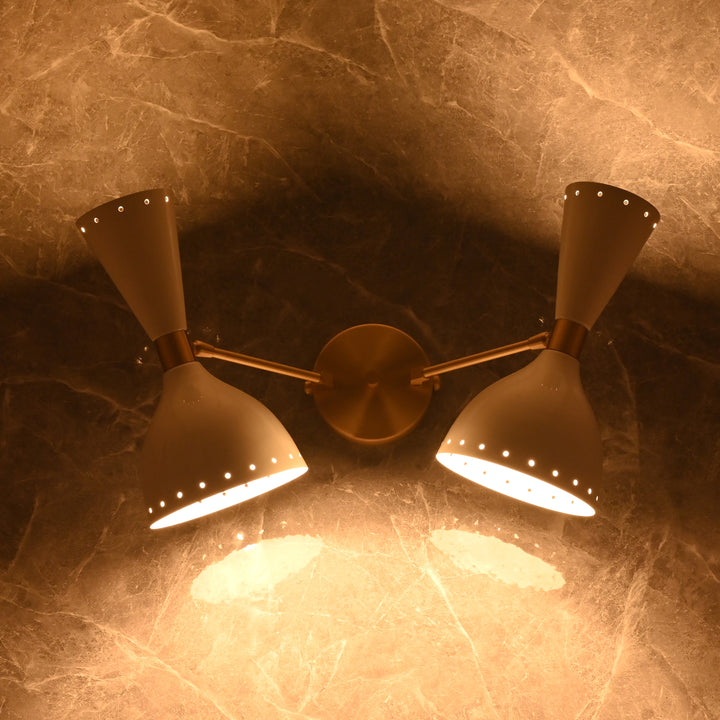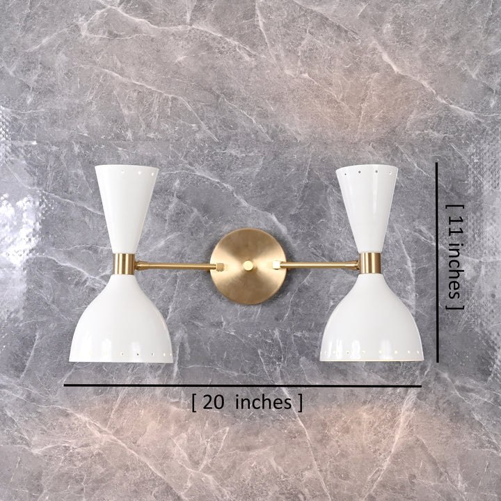 This elegant wall sconce features a dual-cone design, crafted from brass and finished in a refined ivory white tone. The fixture spans 20 inches in width and reaches a height of 11 inches, making it an ideal lighting piece for both residential and commercial interiors. The unique hourglass shape channels mid-century charm while maintaining a clean and sophisticated presence. Each shade is adorned with a delicate perforated rim, allowing light to softly spill through and add an ambient glow to its surroundings. The warm brass arms and backplate introduce a hint of luxury and timelessness, making this sconce perfect for vanity lighting, hallway accents, or flanking a statement mirror.
