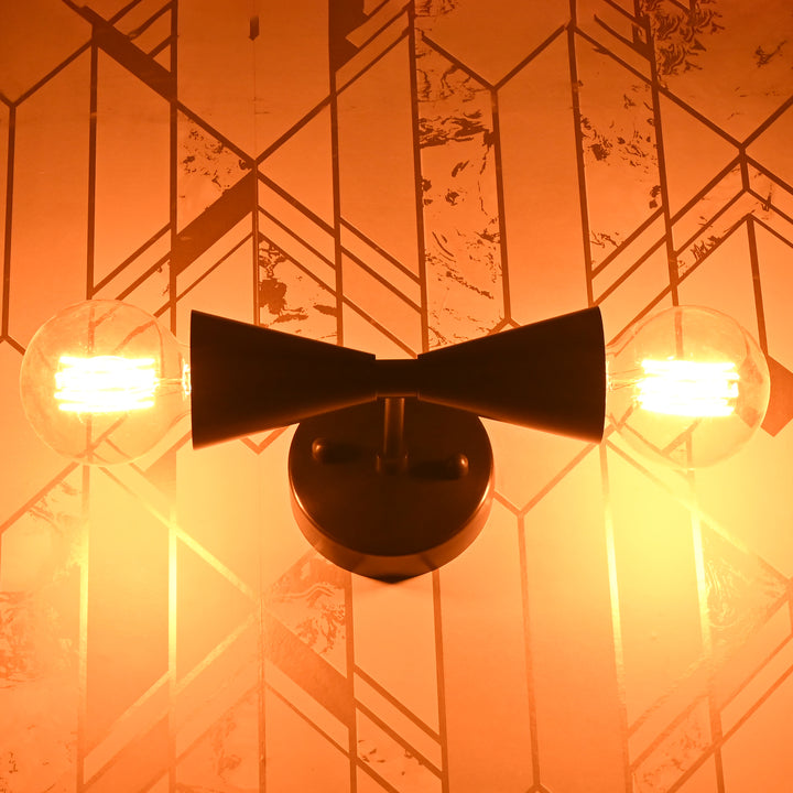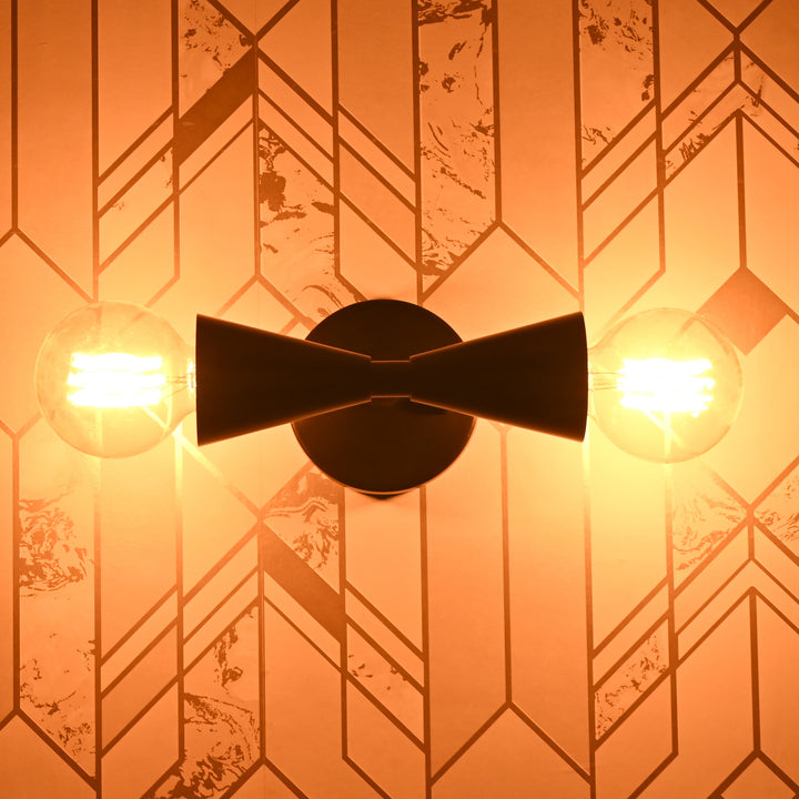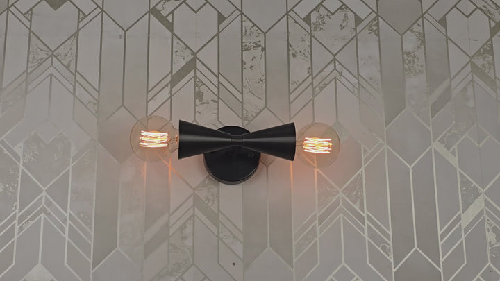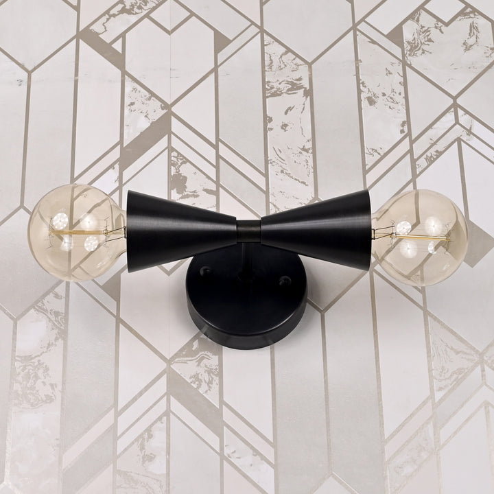 This striking wall sconce merges industrial edge with sculptural minimalism. Featuring dual opposing cone-shaped shades in a matte black finish, the fixture measures 8 inches in width and extends 4 inches from the wall. Each cone holds an exposed bulb that enhances the sconce’s graphic silhouette while delivering a soft, ambient light. The compact form and balanced symmetry make it a versatile addition to a wide range of spaces. Whether used as accent lighting in a hallway or flanking a vanity mirror, this fixture brings bold geometry and modern refinement to any setting.