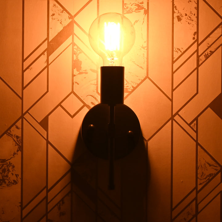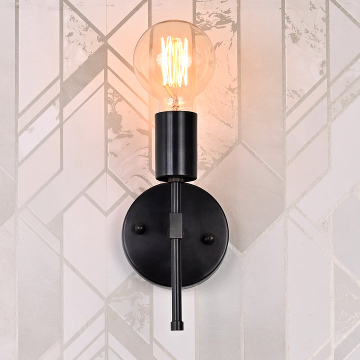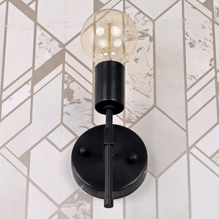 Embodying minimalist charm with industrial character, this wall sconce features a striking blend of matte black metal and a classic Edison bulb. Measuring 8 inches in height and 4 inches in width, the design is compact yet impactful, ideal for both intimate residential spaces and bold commercial interiors. The exposed bulb radiates warm illumination, enhancing its vintage appeal while staying grounded in contemporary aesthetics. Mounted on a circular black backplate, a single vertical stem supports the cylindrical socket, emphasizing symmetry and clean lines. This design is a perfect fit for those who appreciate the balance between simplicity and rugged sophistication.