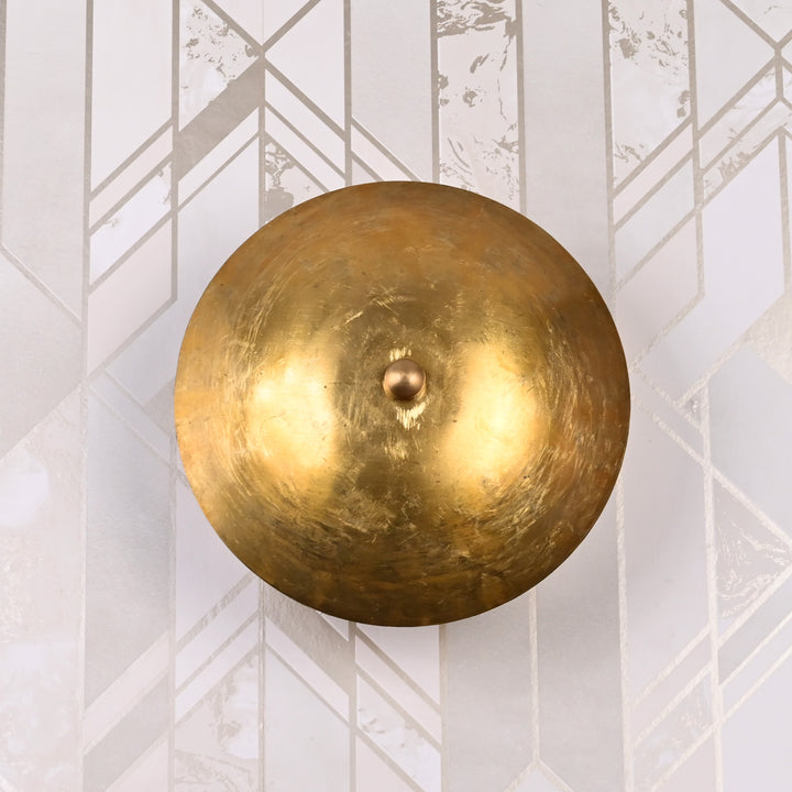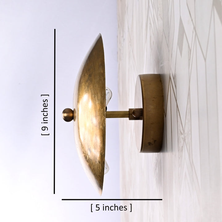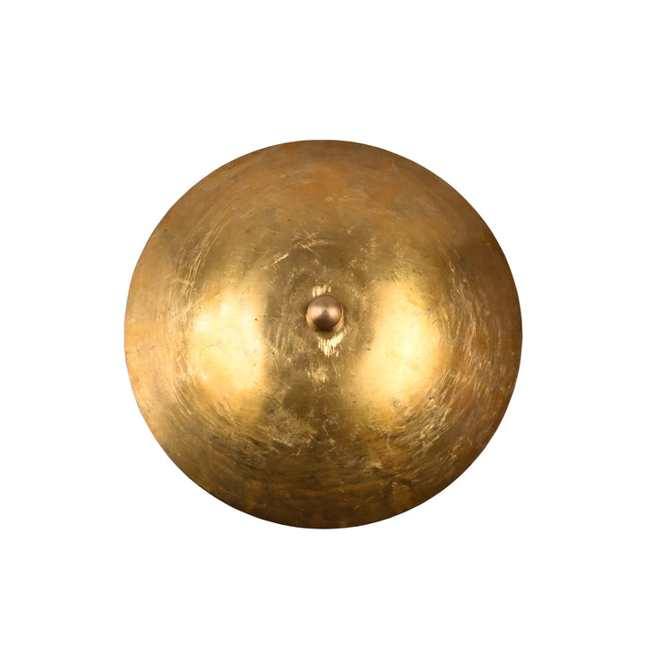 Evoking an old-world charm with a touch of artisanal flair, this dome-shaped brass wall sconce is a timeless addition to both rustic and refined interiors. Measuring 9 inches in diameter and extending 5 inches from the wall, the fixture features a gently aged brass finish that showcases natural texture and character. The half-dome silhouette acts as a sculptural shield for the light source, diffusing a warm, radiant glow across the wall for atmospheric illumination. At the center, a subtle round finial adds a handcrafted touch, while the compact backplate keeps the design grounded and refined. Ideal for entryways, cozy reading corners, or moody restaurant walls, this sconce combines both visual impact and practical lighting.