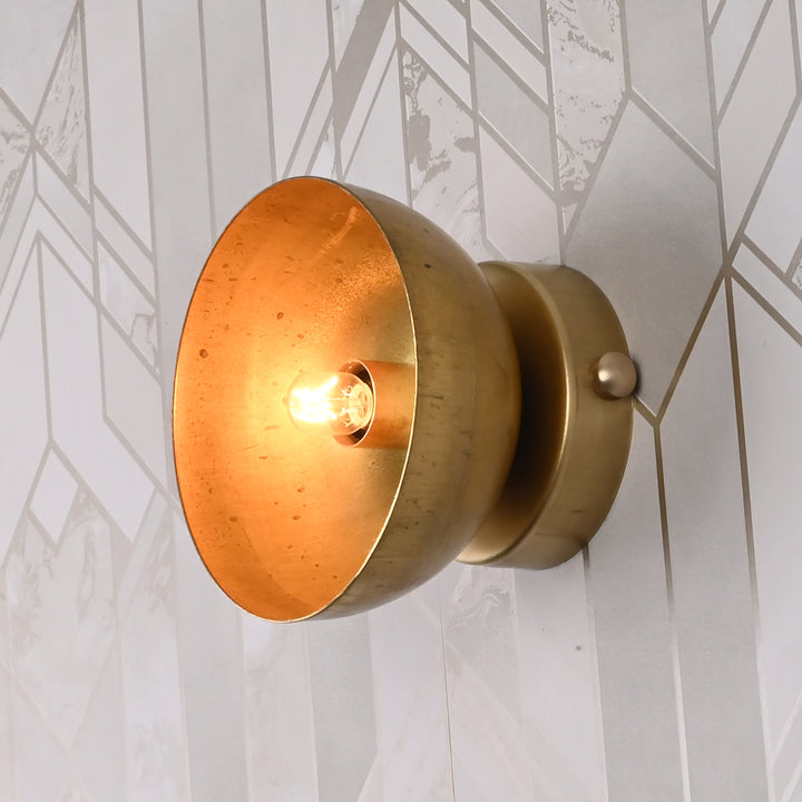 Bring a warm, vintage charm to your walls with this handcrafted brass wall sconce. Designed with a compact 6-inch height and a 4-inch extension, this dome-shaped fixture delivers a focused glow while showcasing timeless elegance. Its raw brass finish beautifully reflects light, creating a soft ambiance perfect for hallways, reading corners, or entryways. Simple yet impactful, this sconce adds a refined touch to modern, industrial, or transitional interiors.