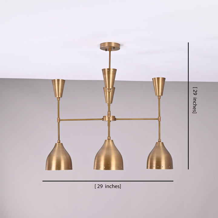 This striking ceiling light fixture features a symmetrical four-arm structure, each arm supporting a pair of conical shades that direct light both upward and downward, creating a dual-lighting effect. With a total of eight lights, it casts an even, balanced glow that enhances both ambient and task lighting. The design maximizes illumination coverage, making it a practical yet stylish centerpiece. The light pattern adds a soft, radiant touch to the ceiling, especially noticeable in dimly lit environments where it creates a dramatic, glowing halo effect. Measuring 29 inches both in height and width, this fixture is ideal for medium to large rooms. Its geometric layout and efficient light distribution make it a standout choice for contemporary interiors.