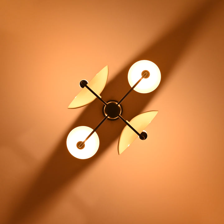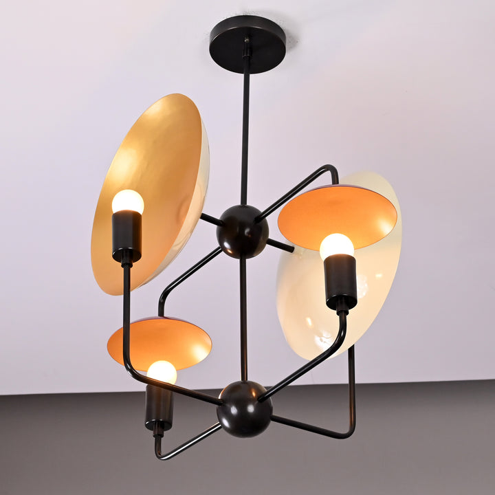 This ceiling light fixture features a unique, geometric design with four evenly spaced bulb holders arranged around a central sphere. It integrates curved, dish-like reflectors behind each bulb to enhance light distribution and visual interest. The structure is supported by a single vertical rod attached to a ceiling mount, ensuring a balanced and sturdy installation. Measuring 27 inches in height and 17 inches in width, this light is ideal for mid-sized to large rooms. When illuminated in a dark room, it casts dramatic, artistic shadows and a warm ambient glow that enhances the atmosphere. The layout ensures that the light is distributed evenly while also creating a striking visual effect. Its contemporary structure blends modern aesthetics with functional lighting, making it a statement piece.