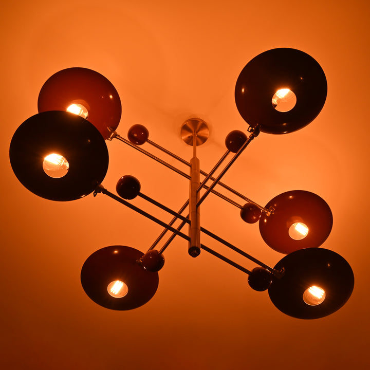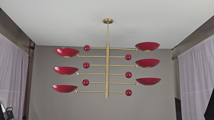 This striking chandelier features a symmetrical structure with six upward-facing bowls, each designed with a center cut that reveals the bulbs within. Supported by a clean central rod and horizontal arms, the layout offers a perfect balance of modern aesthetics and functional illumination. Six bulbs are nestled under the bowls, casting an uplifting light that creates a warm and inviting atmosphere. In a dark room, the chandelier produces a beautiful ambient glow, gently spreading across the ceiling and surrounding space. With dimensions of 50 inches in width and 37 inches in height, it stands as a bold yet refined centerpiece for any interior setting.