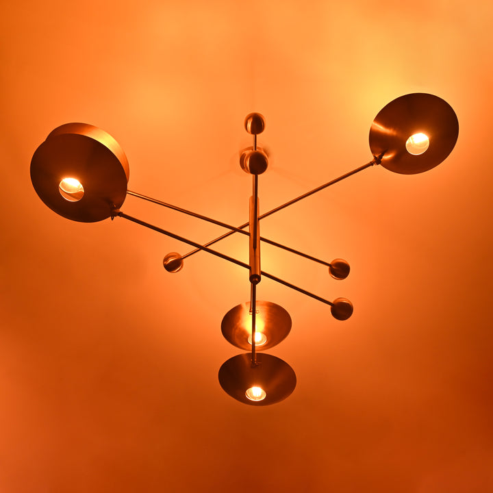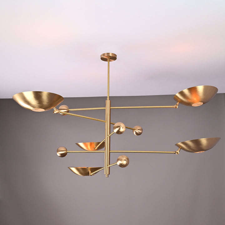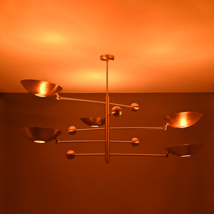 This ceiling light features an artistic uplift design with five bowl-shaped shades, each with a central cut-out that cradles a bulb. The bowls are symmetrically arranged around a central rod, forming a balanced and modern silhouette. With a total width of 61 inches and a depth of 29 inches, it makes a bold statement in open spaces. Each bowl offers broad coverage for soft, ambient lighting. The upward-facing design casts a gentle glow on the ceiling, enhancing the atmosphere of darker rooms. Supported by a sleek vertical rod, the structure is both sturdy and visually refined. The five-bulb setup ensures even illumination. A perfect blend of form and function.