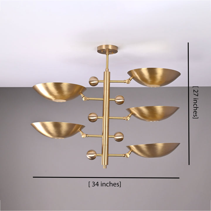 This sculptural ceiling light features a bold vertical structure with five symmetrical arms, each holding a pair of offset bowls with precision-cut centers to expose the bulbs beneath. The unique design allows for both upward and downward lighting, creating a layered illumination effect. When lit in a dark room, the fixture casts a dramatic, radiant glow across the ceiling, enhancing its architectural presence with warm circular reflections. The five exposed bulbs are housed neatly within the bowls, delivering a balanced distribution of light. Its sleek and structured build spans 34 inches in width and extends 27 inches from the ceiling, making it a standout statement in any modern interior.
