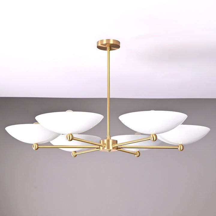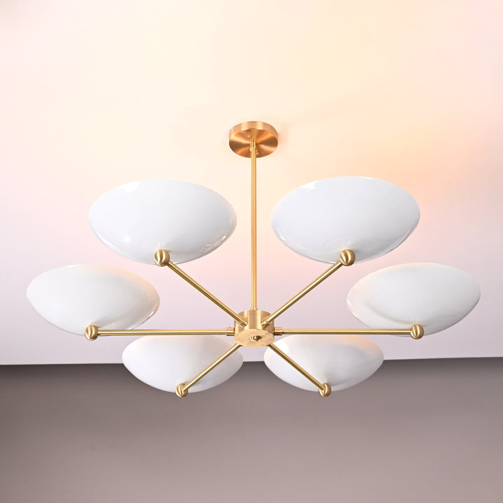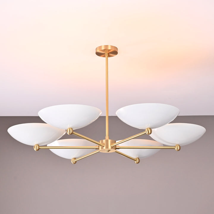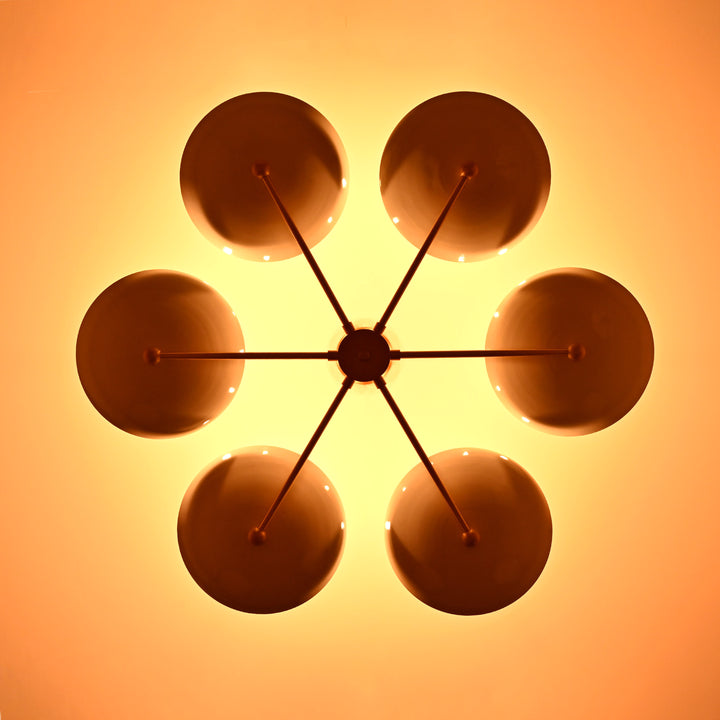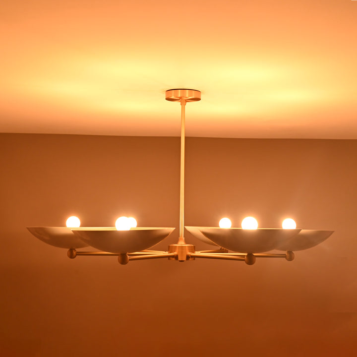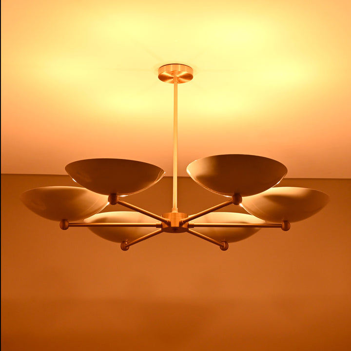 This refined ceiling fixture showcases a harmonious arrangement of six elegantly contoured bowl-shaped shades, each encasing a singular bulb that emits a soft, radiant glow. The arms extend symmetrically from a central axis, creating a sculptural composition that blends architectural precision with contemporary flair. When illuminated in a darkened environment, the chandelier produces a mesmerizing ambient effect—casting a warm, expansive halo that envelops the room in a serene, atmospheric light. Its structural design not only ensures balanced luminance but also serves as a striking visual centerpiece. Measuring 40 inches across and descending 22 inches from the ceiling, it is ideally proportioned for sophisticated interiors seeking both function and artistry.