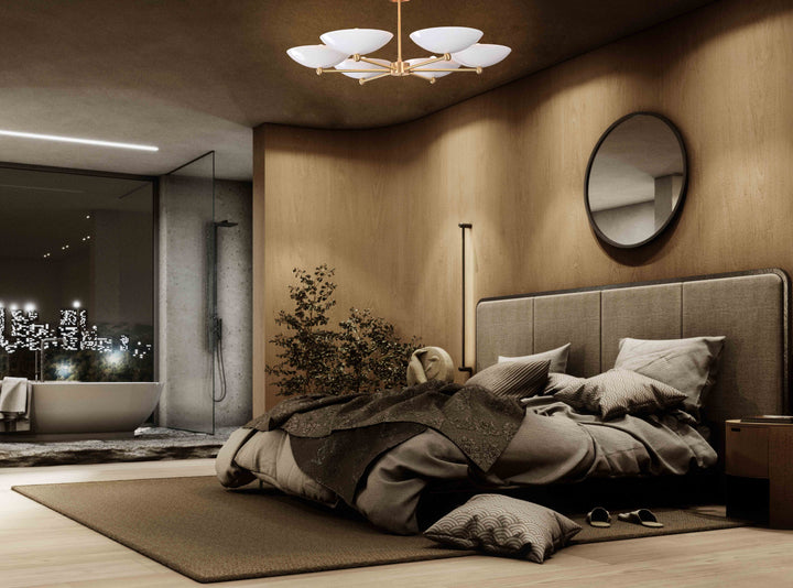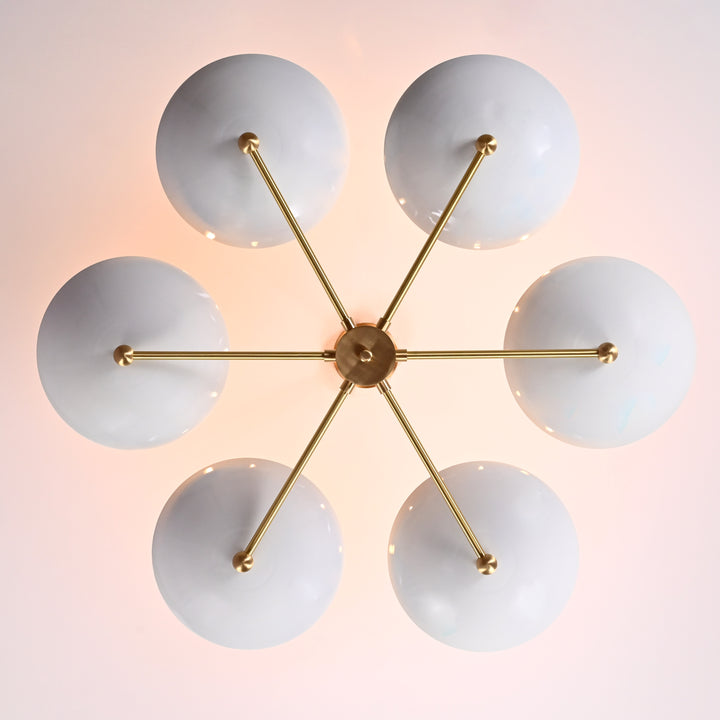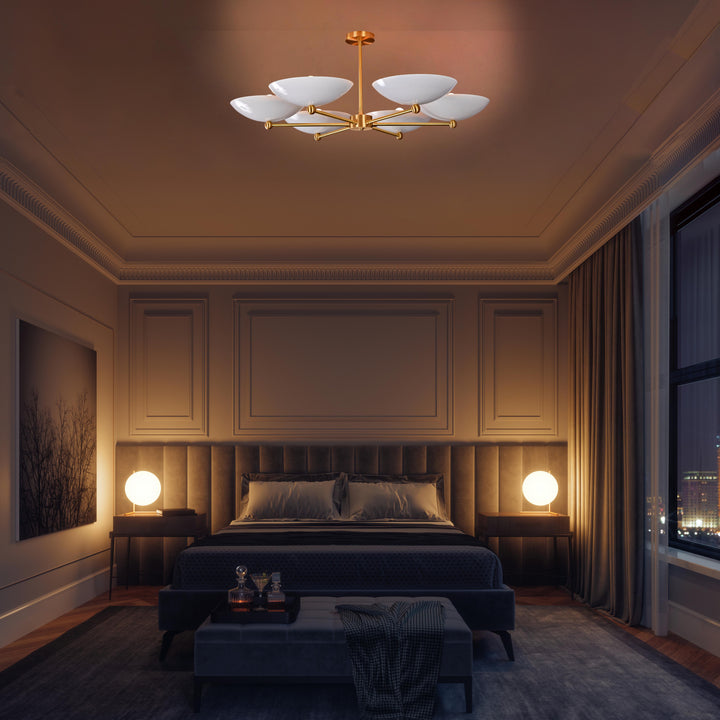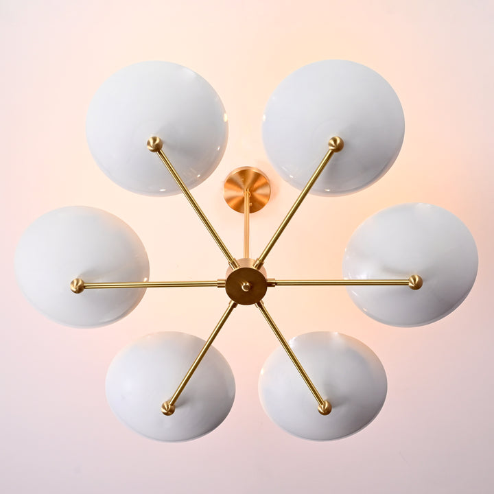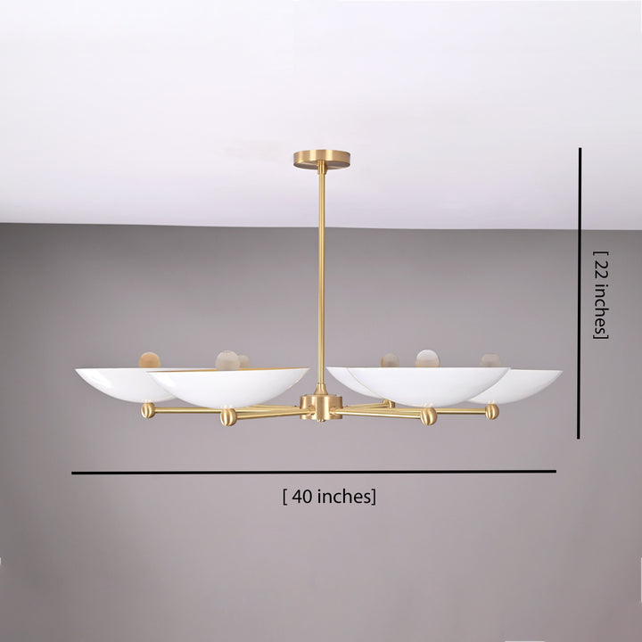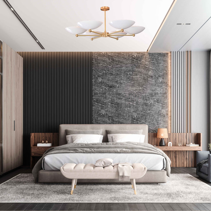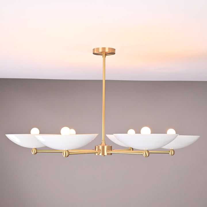 This refined ceiling fixture showcases a harmonious arrangement of six elegantly contoured bowl-shaped shades, each encasing a singular bulb that emits a soft, radiant glow. The arms extend symmetrically from a central axis, creating a sculptural composition that blends architectural precision with contemporary flair. When illuminated in a darkened environment, the chandelier produces a mesmerizing ambient effect—casting a warm, expansive halo that envelops the room in a serene, atmospheric light. Its structural design not only ensures balanced luminance but also serves as a striking visual centerpiece. Measuring 40 inches across and descending 22 inches from the ceiling, it is ideally proportioned for sophisticated interiors seeking both function and artistry.