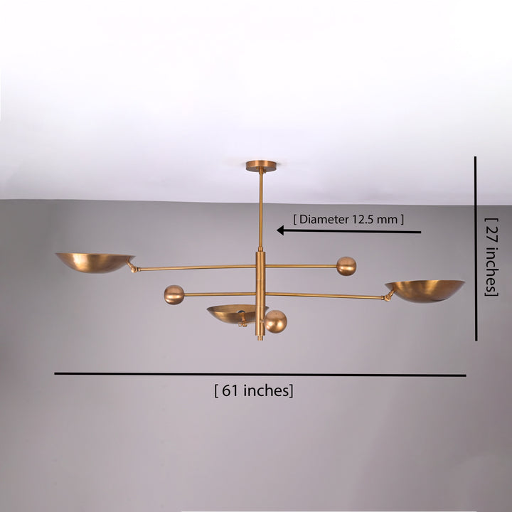 Elevate your space with this striking ceiling light fixture designed to combine form and function effortlessly. Featuring three upward-facing bowl-shaped shades and three spherical bulb housings, this piece delivers a harmonious and sculptural aesthetic. With a width of 61 inches and a drop of 27 inches from the ceiling, it commands attention while providing ample coverage. The sleek rods support the structure with clean lines and geometric precision. Light is directed upward, creating an ambient, uplifting glow that beautifully reflects off the ceiling. In a dark room, the fixture produces a warm, diffused illumination, adding depth and softness to the environment. Its balanced design makes it a perfect centerpiece for modern and minimal spaces.