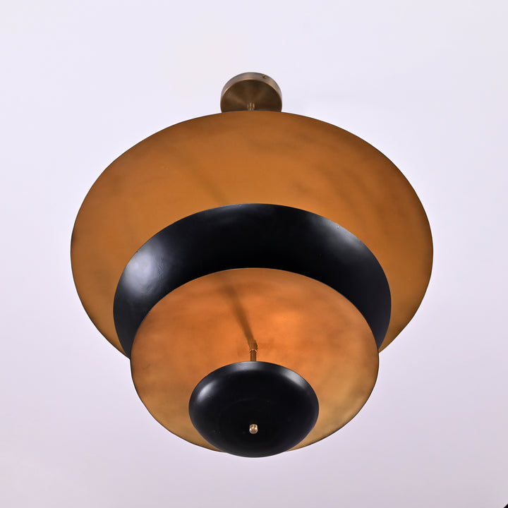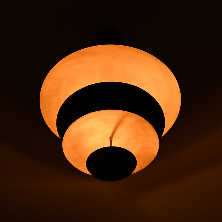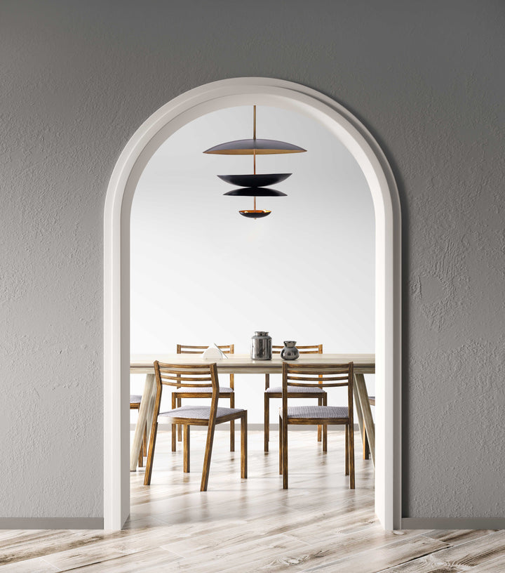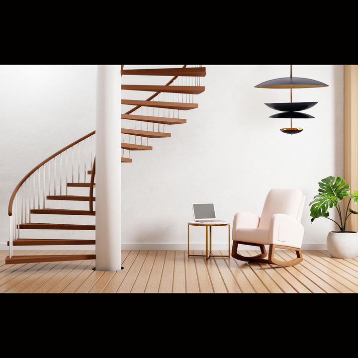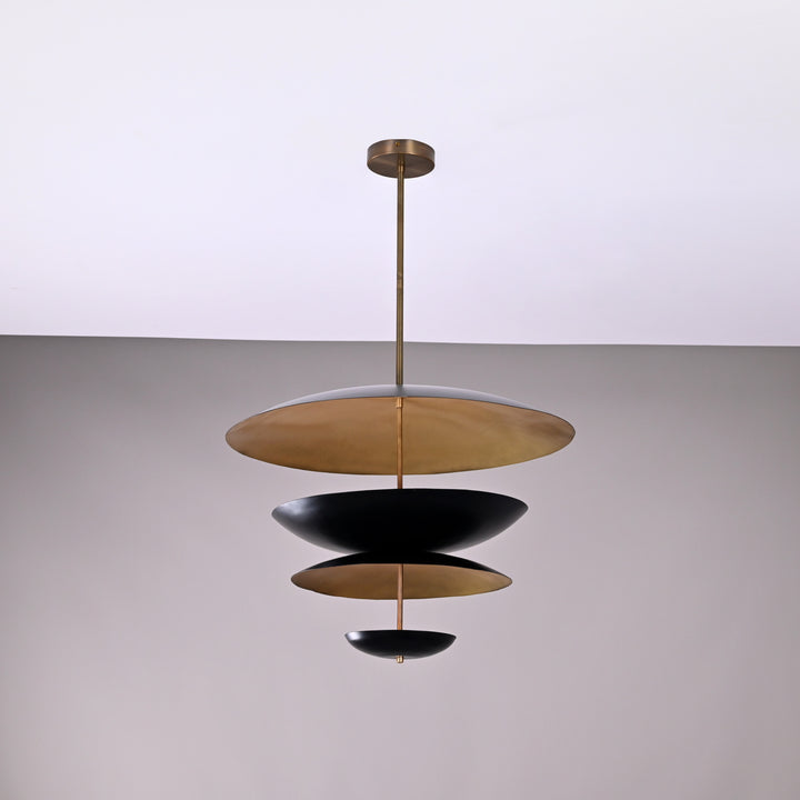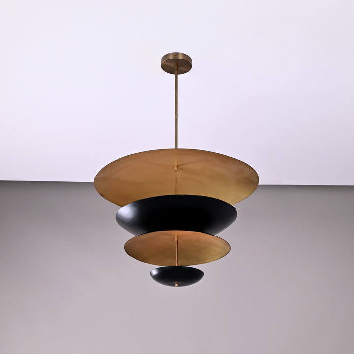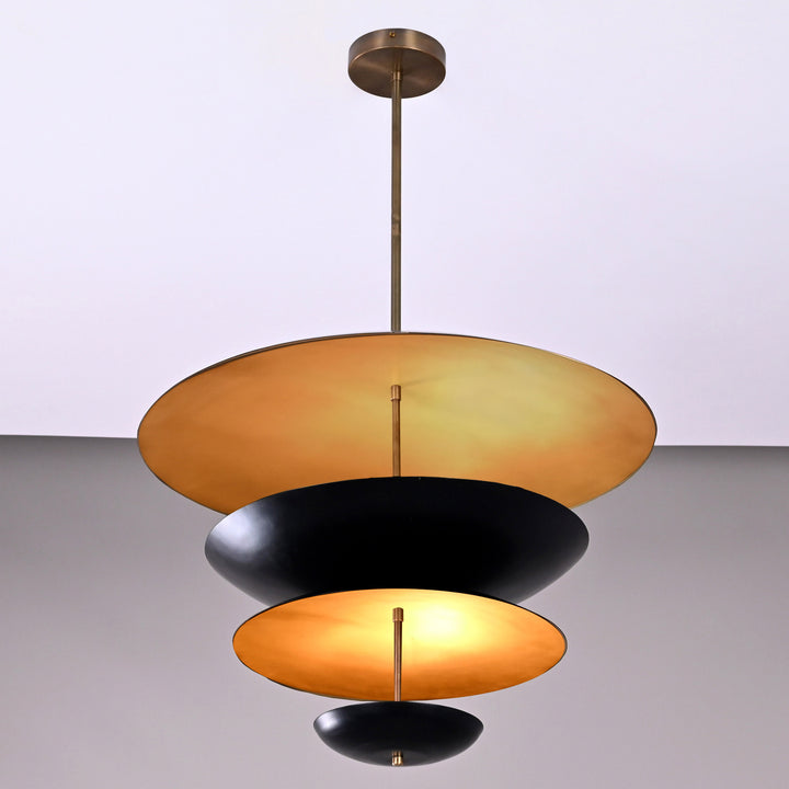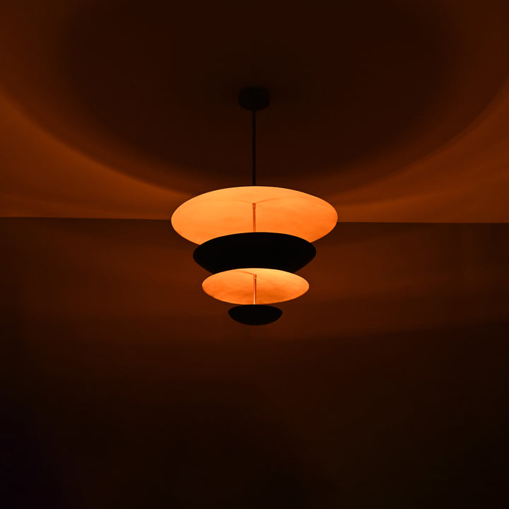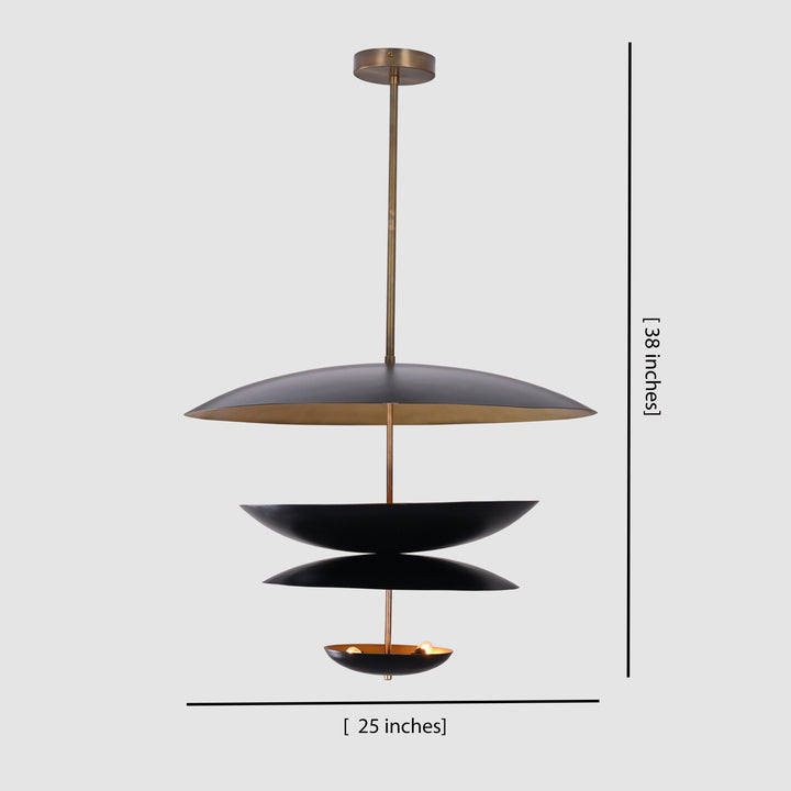 Elevate your space with this breathtaking disc-style chandelier, crafted to make a lasting impression. The design features a bold arrangement of four open, dish-shaped shades stacked gracefully along a sleek central rod, creating a striking, sculptural silhouette. Housing a total of eight lights—five E26 bulbs and three E12 bulbs—it offers a brilliant, layered illumination ideal for modern interiors. With a dimension of 25 inches in width and 38 inches in height, it balances presence and elegance perfectly. In a dark room, the chandelier projects a stunning concentric glow effect on the ceiling, enhancing the mood with dramatic, warm light. The unique disc structure ensures an ambient blend of upward and downward lighting, adding depth and character to any room.