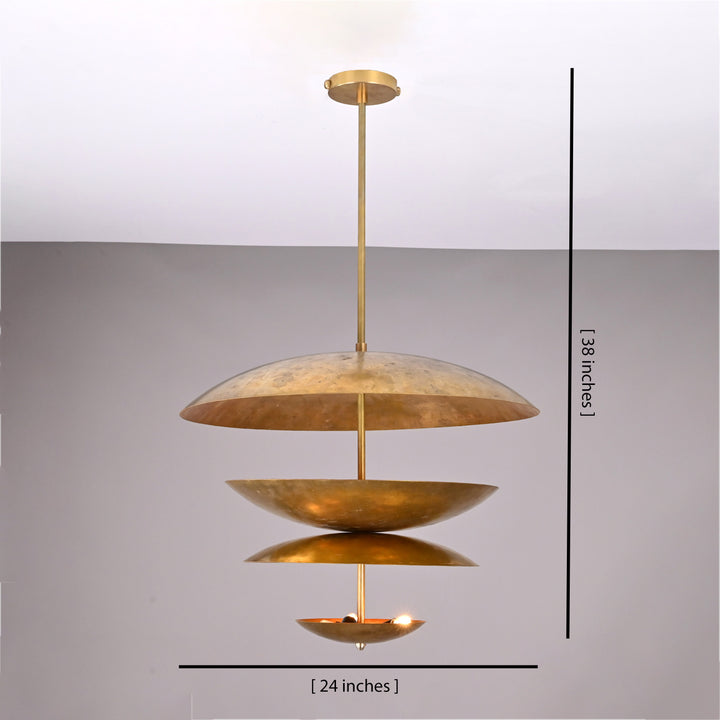 Elevate your space with this breathtaking disc-style chandelier, crafted to make a lasting impression. The design features a bold arrangement of four open, dish-shaped shades stacked gracefully along a sleek central rod, creating a striking, sculptural silhouette. Housing a total of eight lights—five E26 bulbs and three E12 bulbs—it offers a brilliant, layered illumination ideal for modern interiors. With a dimension of 24 inches in width and 38 inches in height, it balances presence and elegance perfectly. In a dark room, the chandelier projects a stunning concentric glow effect on the ceiling, enhancing the mood with dramatic, warm light. The unique disc structure ensures an ambient blend of upward and downward lighting, adding depth and character to any room.