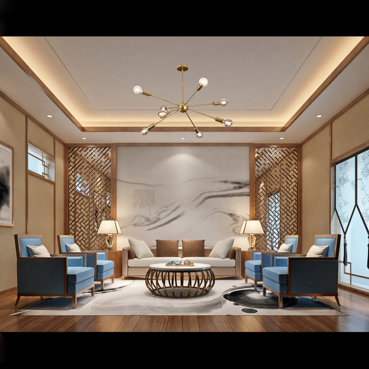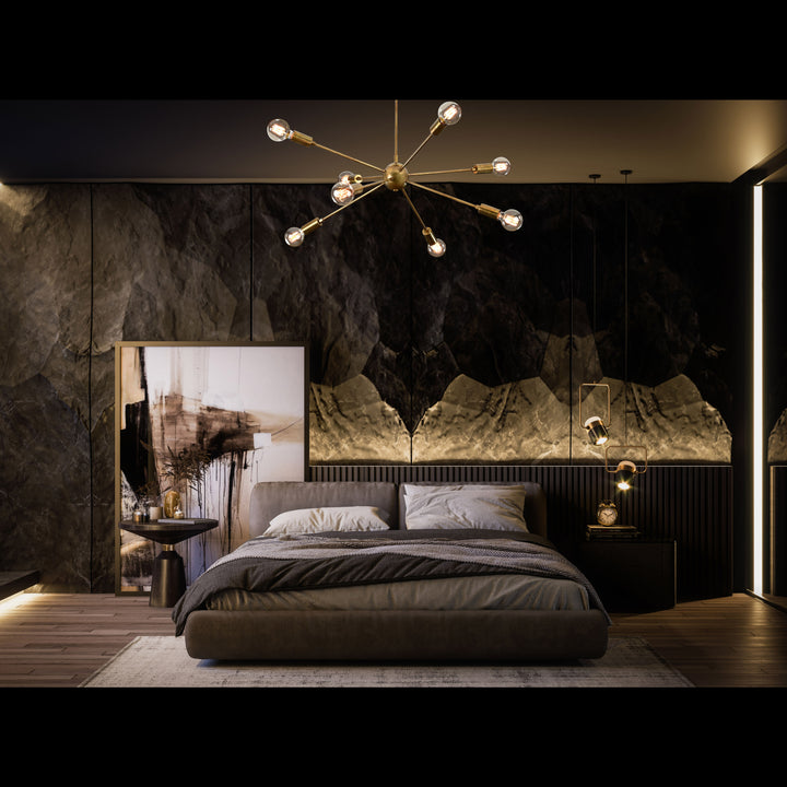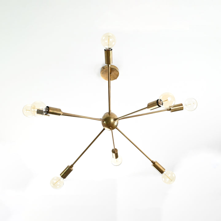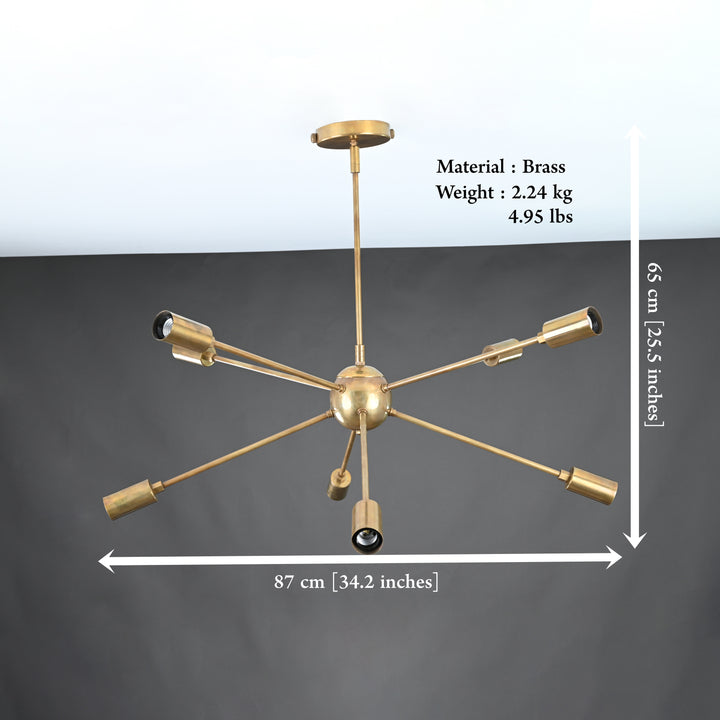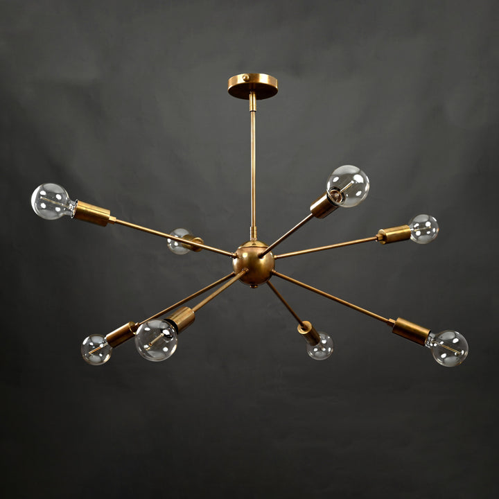 Elevate your space with this stunning Sputnik chandelier, a perfect fusion of mid-century charm and modern sophistication. Crafted in a brass antique finish, this eye-catching fixture features eight sleek arms, each radiating from a central globe for a bold, symmetrical design that draws the eye from every angle. Measuring 30 inches wide and 27 inches high, it’s perfectly sized to make a statement in dining rooms, living spaces, or entryways. With its dynamic silhouette and timeless elegance, this chandelier brings a warm, modern glow and an instant touch of designer flair to any room.