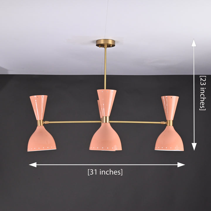 This 4-arm ceiling chandelier features a striking Diabolo-style design with dual-headed shades on each arm, providing a total of 8 lights. The two-way lighting casts illumination both upward and downward, creating a balanced glow and highlighting the fixture’s sculptural form. Measuring 31 inches wide and 23 inches high, it fits beautifully in various spaces. In darker rooms, it produces a warm, ambient light that enhances the mood and adds a sophisticated touch. Ideal for living rooms, dining areas, or any setting in need of a bold statement piece.