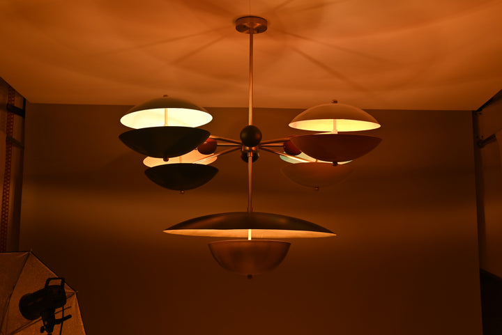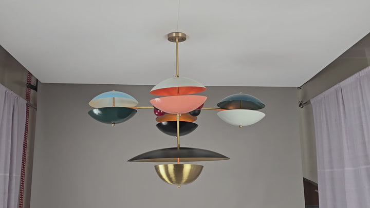 This chandelier features a striking disc and dome style structure with a modern sculptural design. Each bowl-shaped shade houses three lights, bringing the total to fifteen lights distributed symmetrically around the fixture. The layered arrangement of domes and discs creates an eye-catching visual effect, especially when illuminated. In a dark room, this chandelier casts dynamic, soft glows and layered shadows across the ceiling and walls, enhancing the ambiance with its artistic presence. The overall dimensions of the chandelier are 43 inches in width and 38 inches in height, making it an ideal statement piece for spacious interiors.