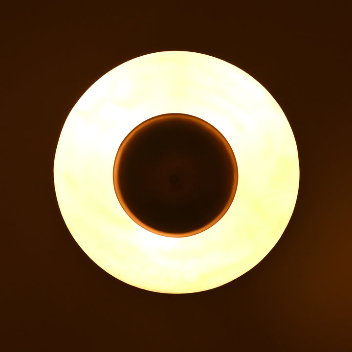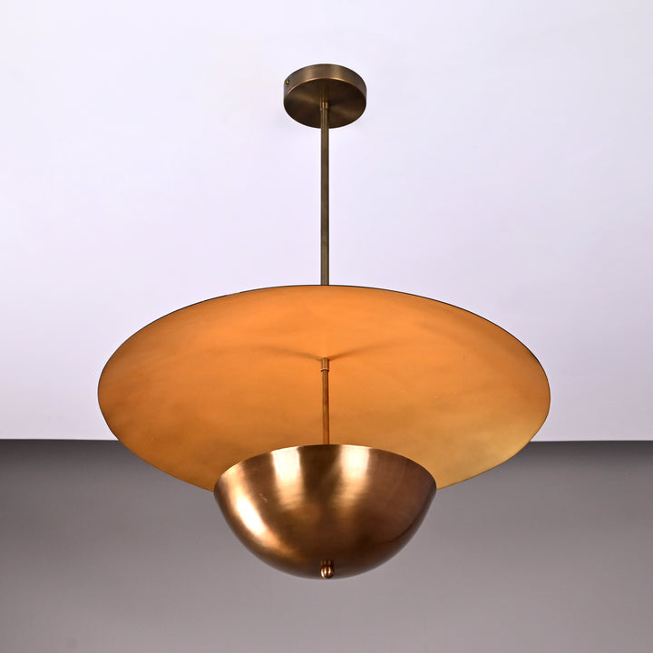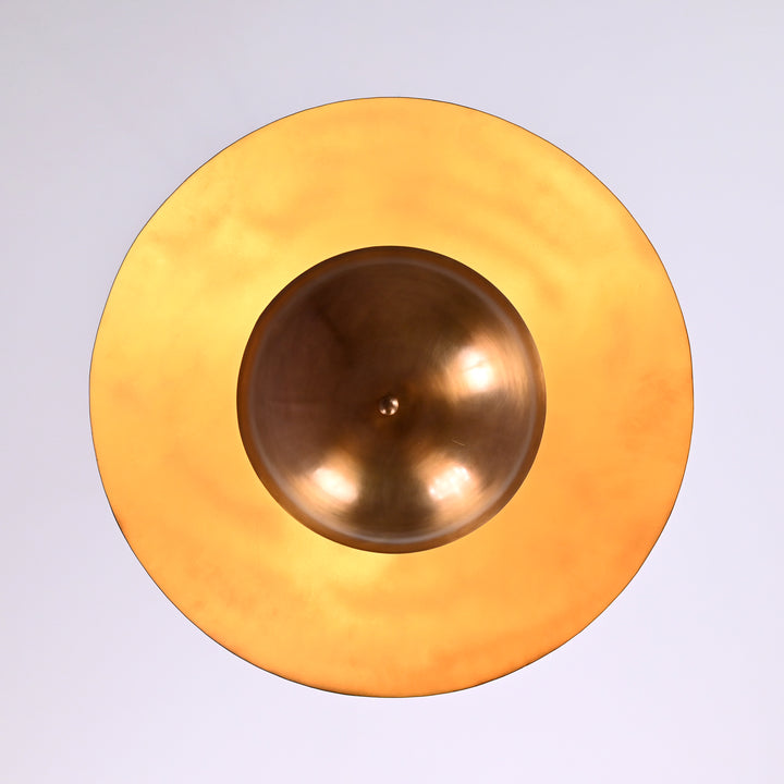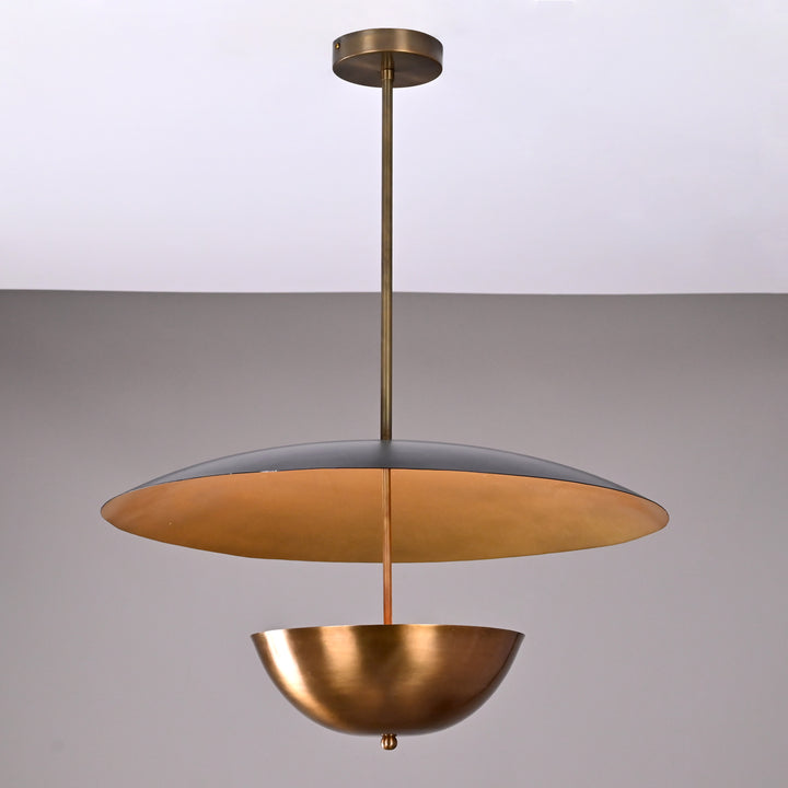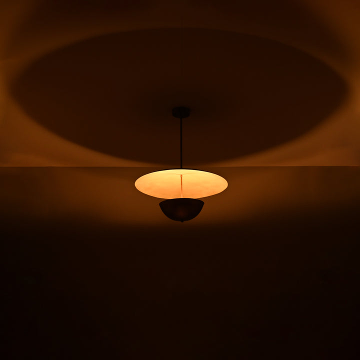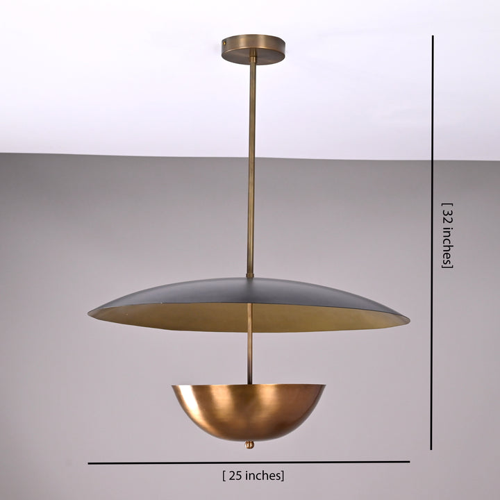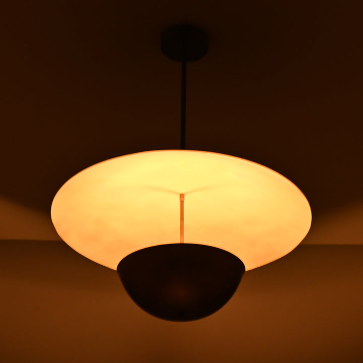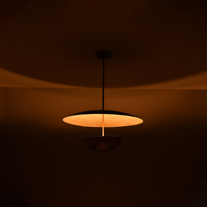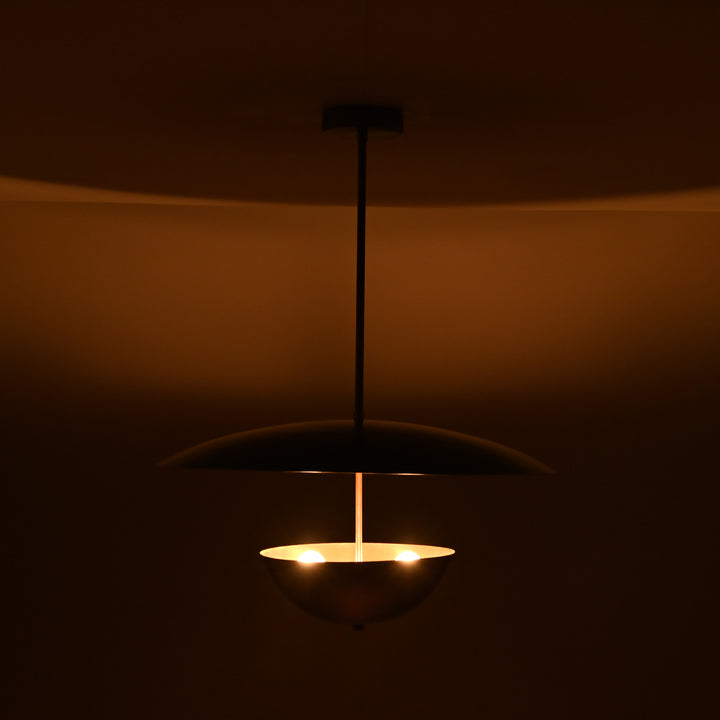 This striking chandelier features a suspended disc and dome structure, elegantly connected by a central rod, creating a distinctive silhouette. The design incorporates three lights, housed within the lower dome, beautifully diffusing light upwards and across the wide disc above. With a diameter of 25 inches and a total height of 32 nches, it offers a bold presence without overwhelming the space. When illuminated in a dark room, the chandelier produces a warm, ambient glow that highlights the unique form and casts soft, atmospheric shadows on the ceiling. The meticulous structure emphasizes both balance and minimalism, offering a timeless statement for modern interiors.