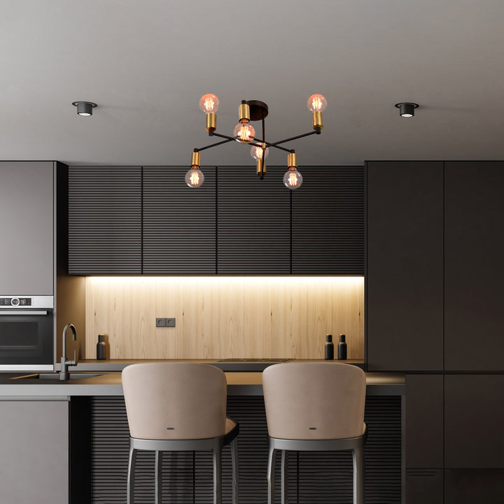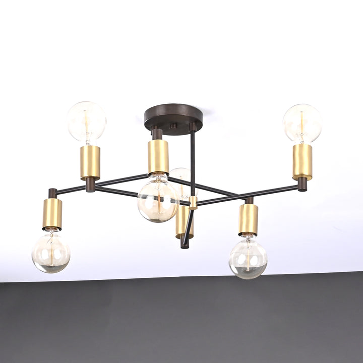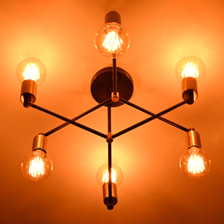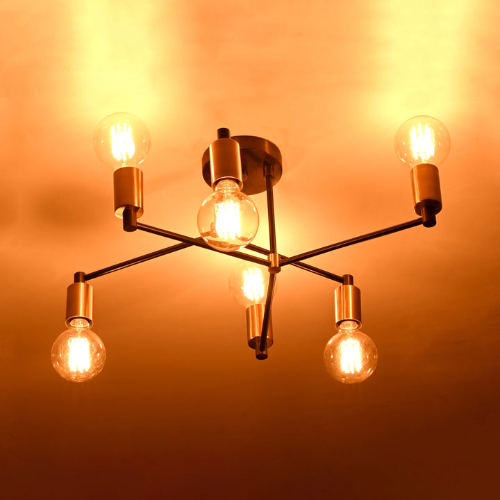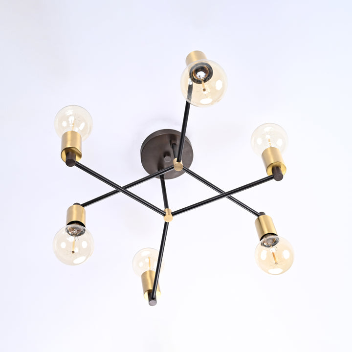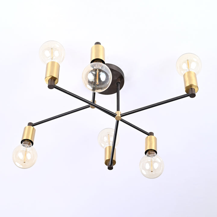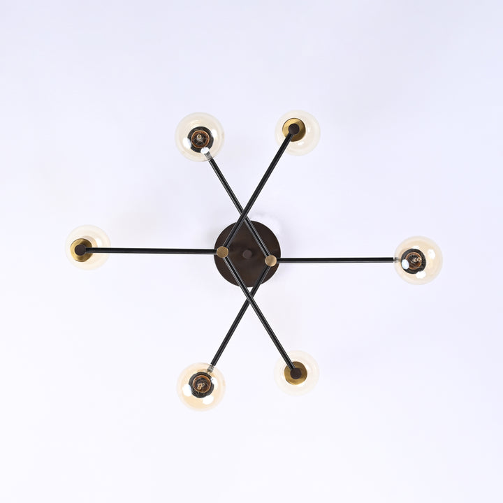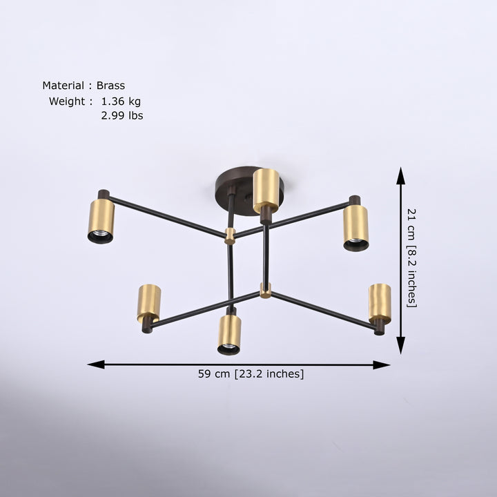Crafted from fine brass, this ceiling light fixture merges sculptural design with modern sophistication. Measuring 59 cm (23.2 inches) across and 21 cm (8.2 inches) in height, it features six precisely aligned lights, each extending from a central axis in a geometric configuration. The interplay of sleek black rods and brushed gold accents creates a striking visual contrast, making it a refined centerpiece for contemporary interiors. Ideal for living rooms, dining areas, or entryways, this piece offers both ambient glow and architectural presence.