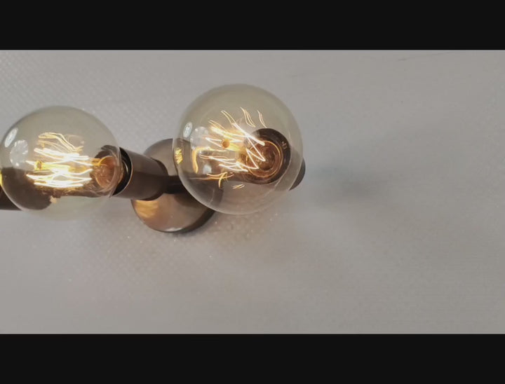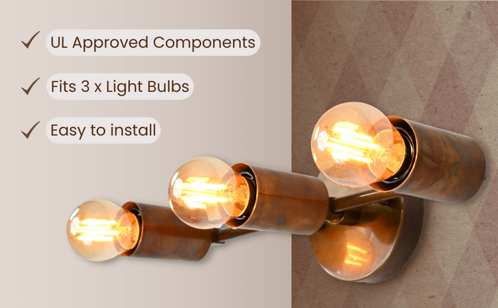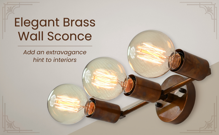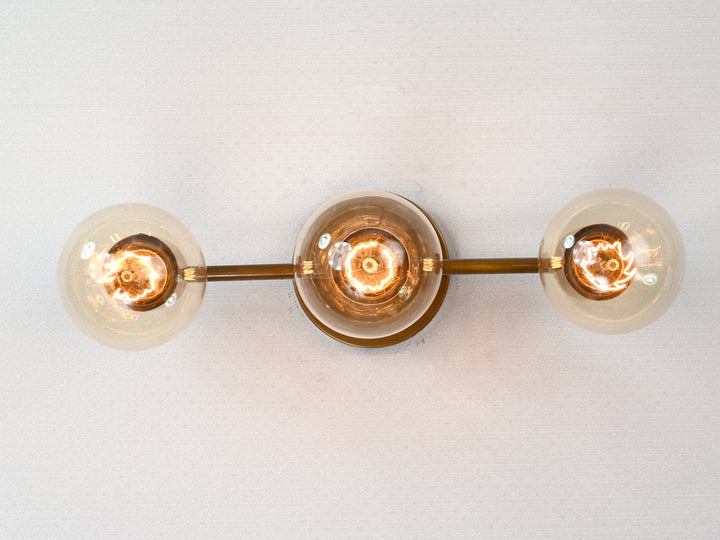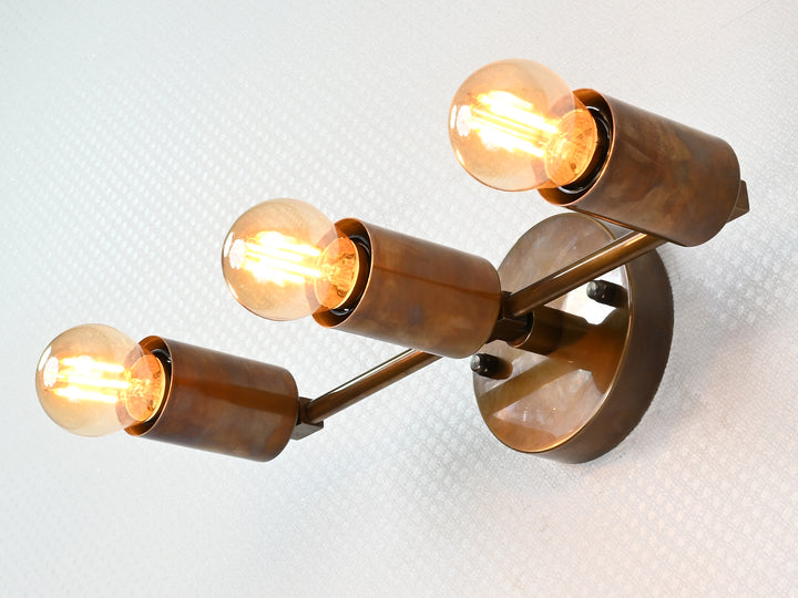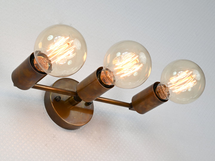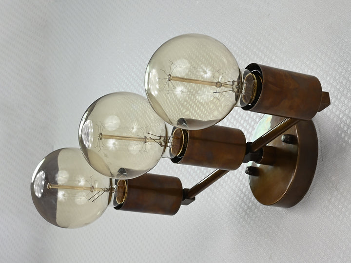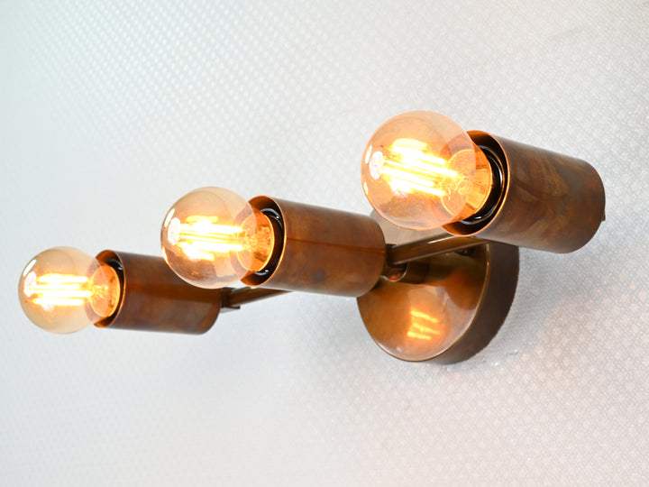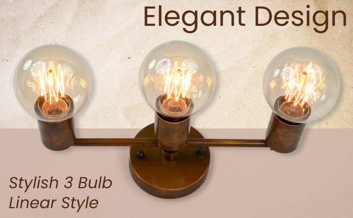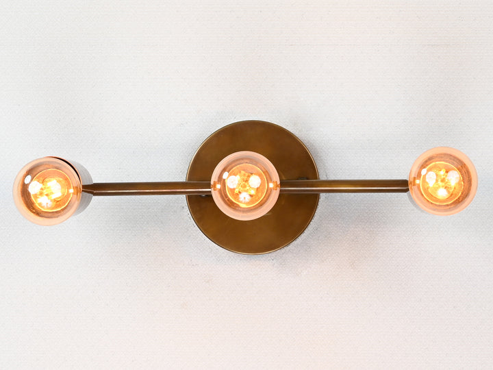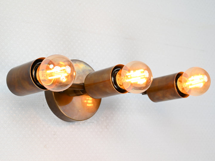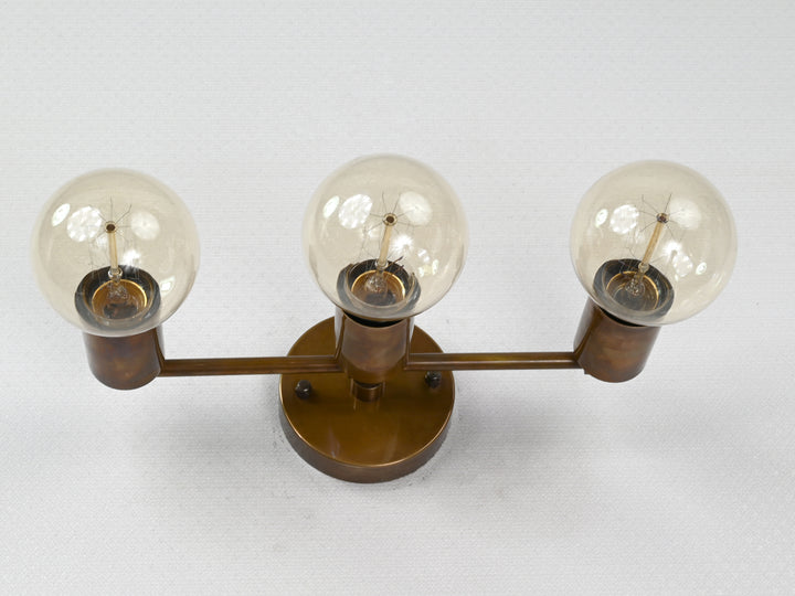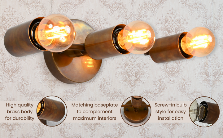 Understated yet impactful, this three-light wall sconce features a timeless linear silhouette and rich, vintage character. Crafted from solid brass with an aged patina, it showcases three cylindrical sockets aligned along a horizontal bar, radiating from a round central base. Its compact form makes it an excellent choice for accent lighting while still delivering eye-catching elegance. Measuring 30 cm (12 inches) in width and 9.6 cm (4 inches) in height, this fixture is designed for versatility—ideal for hallways, compact bathrooms, or flanking artwork. The weathered brass finish brings depth and antique appeal, while the clean geometry ensures it complements both classic and modern interiors. A true blend of form and function, it offers ambient glow with architectural finesse.