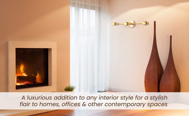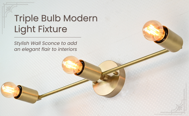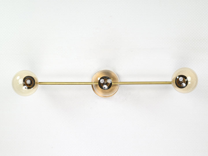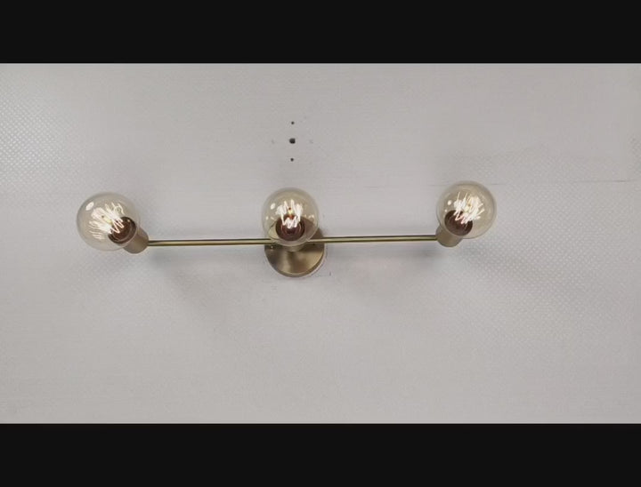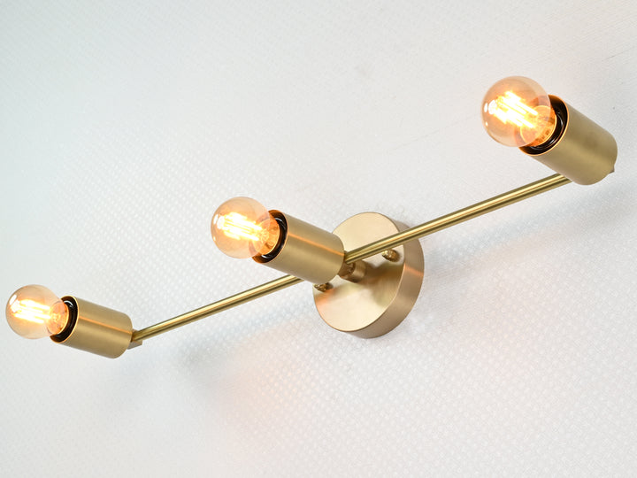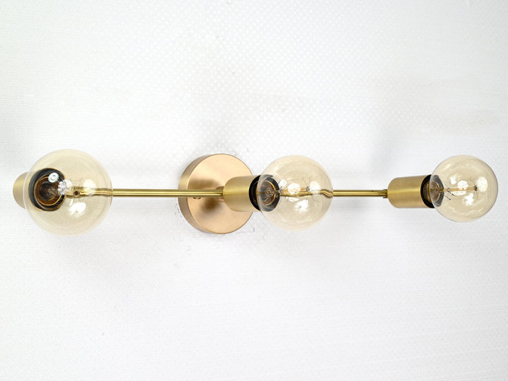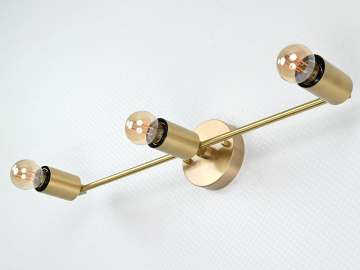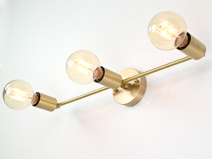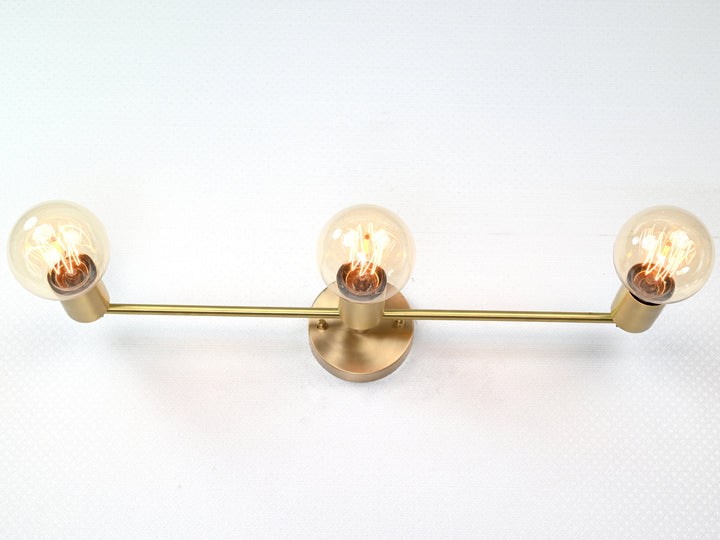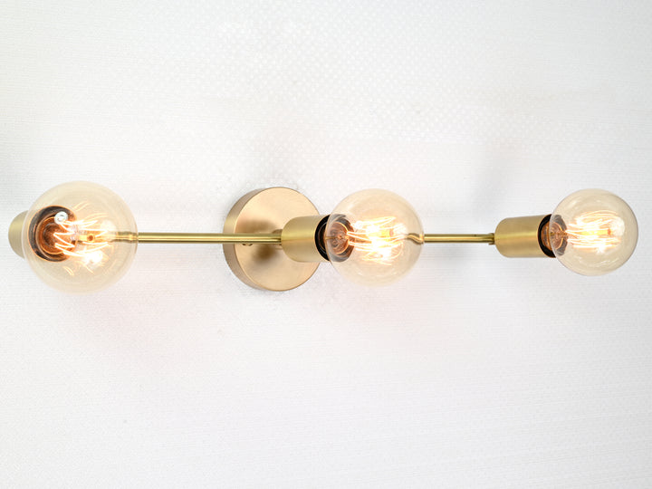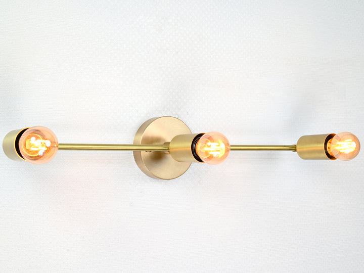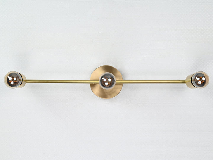 Expertly constructed from high-quality brass, this wall-mounted fixture exemplifies refined craftsmanship and minimalist design. Measuring 52.5 cm in width and standing 9.6 cm tall, its symmetrical linear form is anchored by a circular backplate, from which a slender rod extends to hold three cylindrical bulb holders. The brushed brass finish adds a warm, golden luster, imparting an understated luxury to any space. Designed to accommodate exposed filament or globe bulbs, the fixture provides a soft, ambient glow that complements both daylight and evening atmospheres. Ideal for contemporary lofts, modern powder rooms, above vanity mirrors, or styled as a hallway feature, this piece merges form and function with effortless poise. Pair with warm Edison bulbs for a nostalgic touch, or use clear LEDs for a crisp modern edge. Whether mounted solo or in series, it offers an architectural clarity that speaks to both modern restraint and vintage charm.