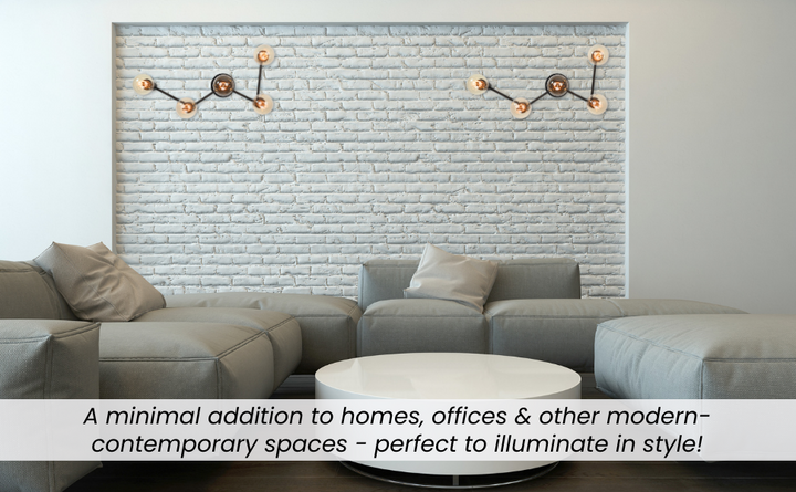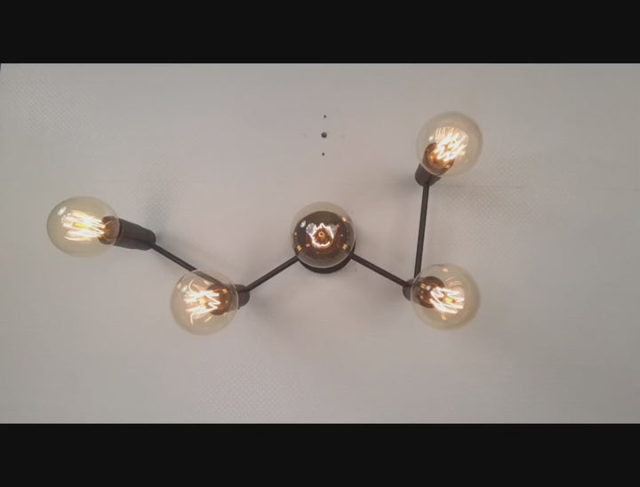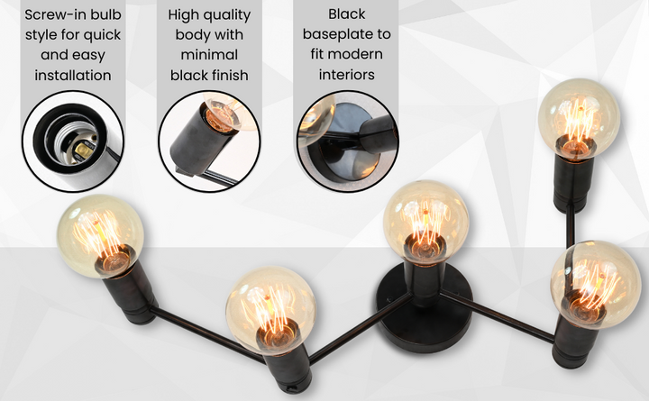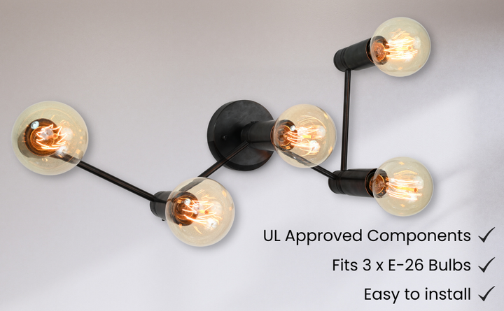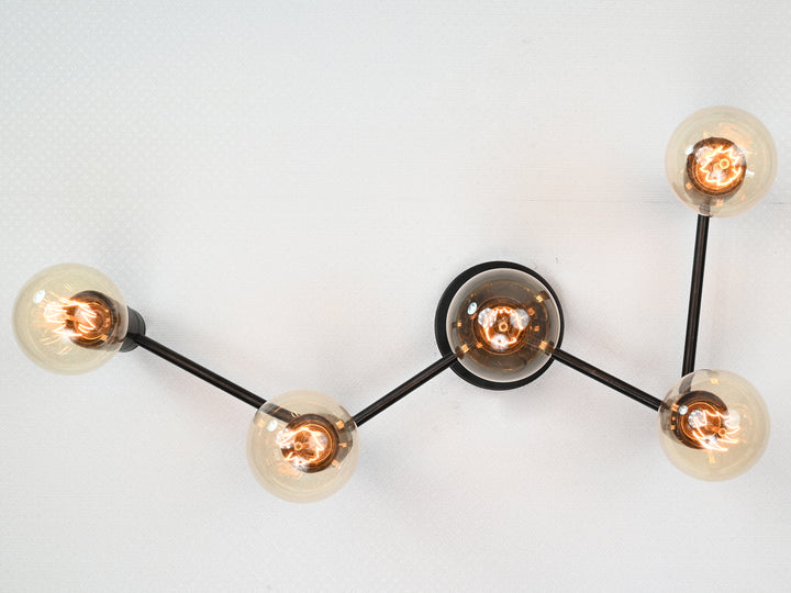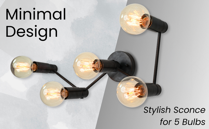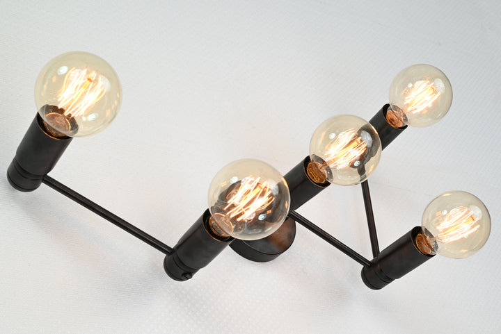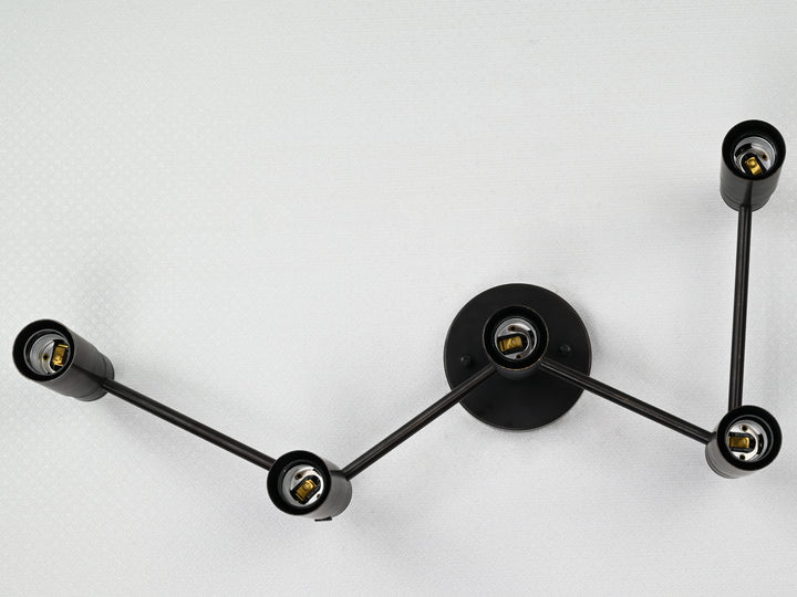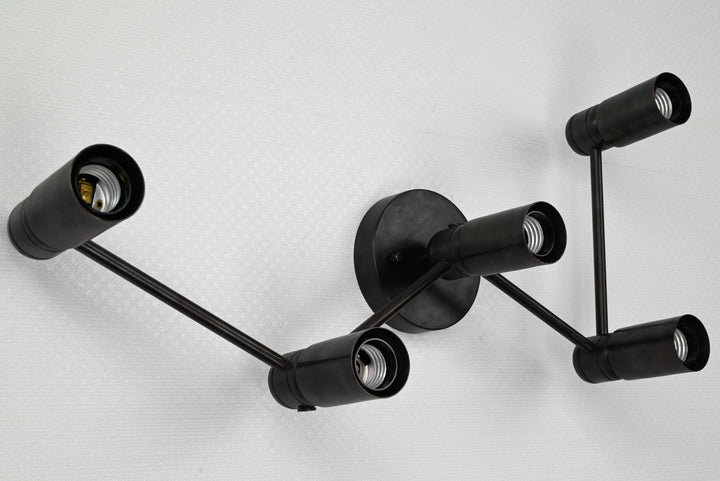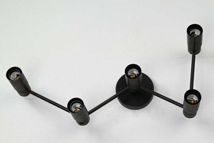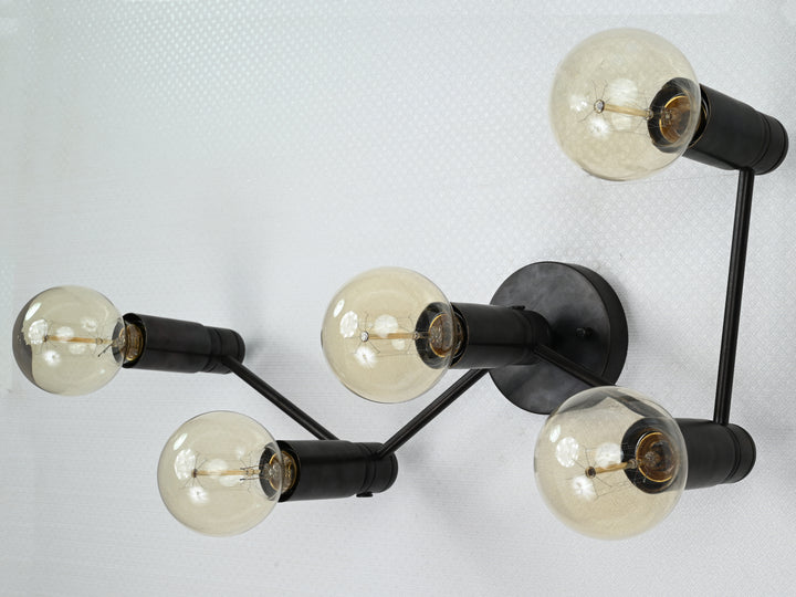Elevate your space with this bold and artfully engineered 5-light wall sconce, where form meets function in perfect harmony. Handcrafted from premium-quality brass and finished in an elegant matte black, this fixture showcases a striking, asymmetric layout with five precisely angled arms extending from a central hub. Measuring 51 cm (20 inches) in width and 23 cm (9 inches) in height, it commands attention without overwhelming the wall, making it a perfect choice for curated interiors that value sculptural lighting. Each cylindrical socket is meticulously positioned to create visual balance while casting multidirectional light—ideal for creating ambiance in modern lofts, creative studios, gallery walls, or stylish commercial settings. The contrast between the sleek black structure and exposed bulbs adds a layer of drama and sophistication, especially when paired with warm, vintage-style Edison bulbs. Whether used as a functional lighting solution or an artistic focal point, this fixture offers timeless appeal through minimalist design and architectural presence.