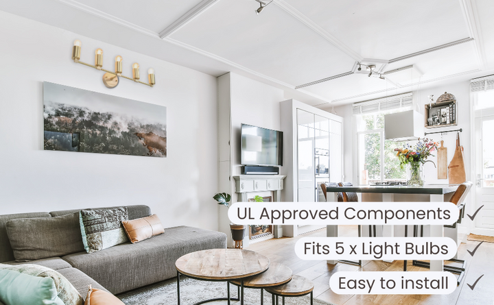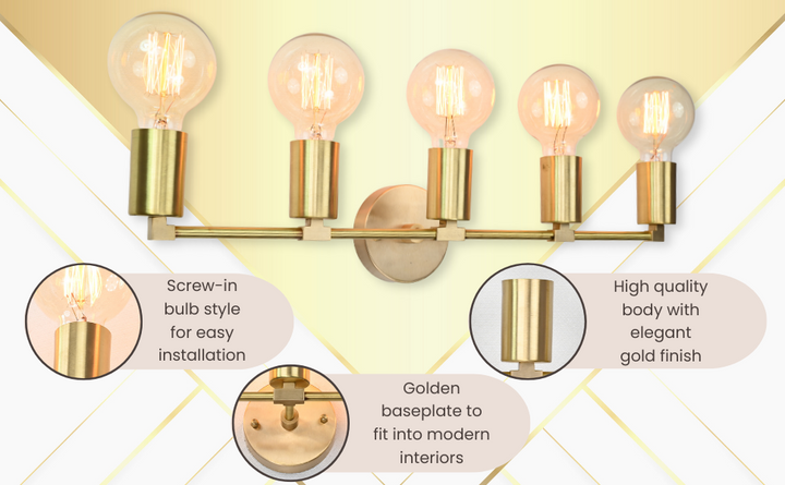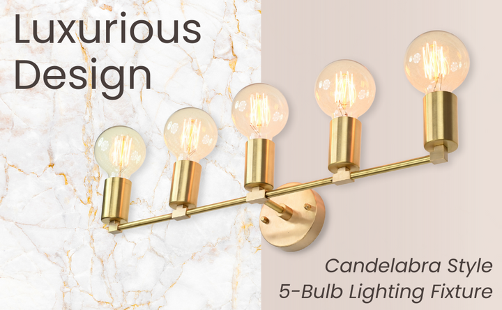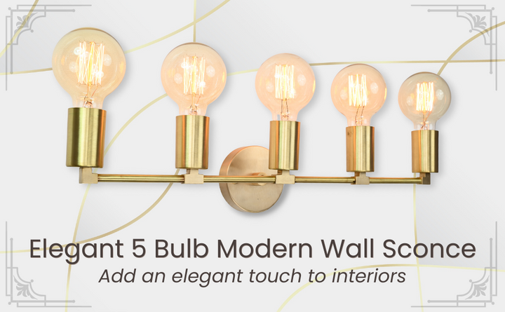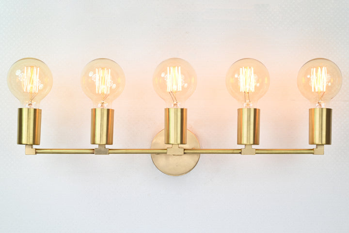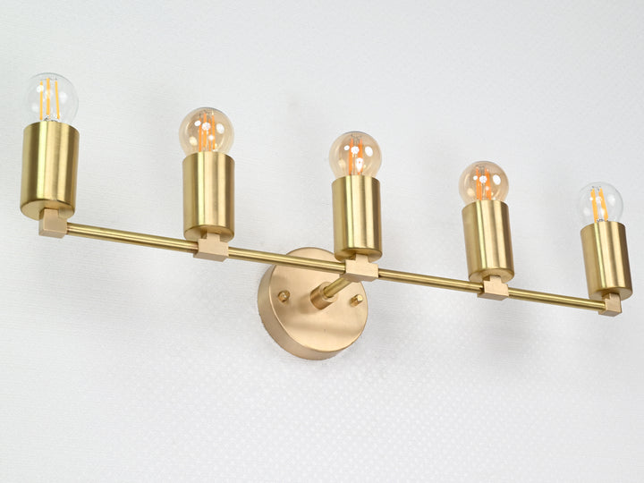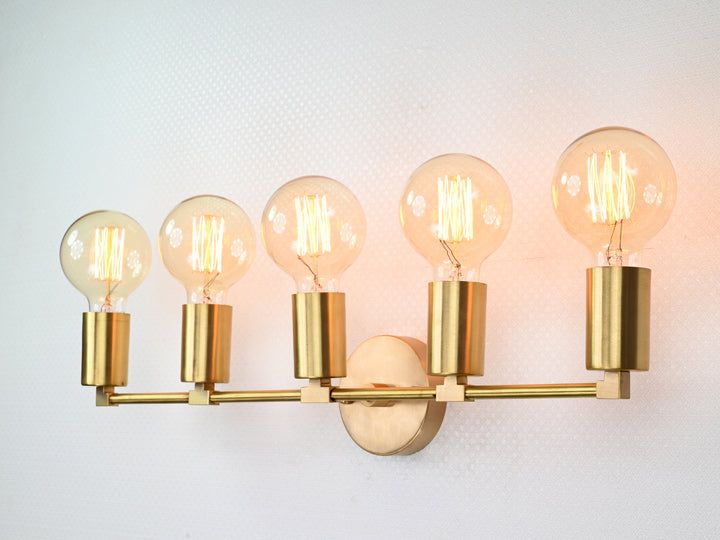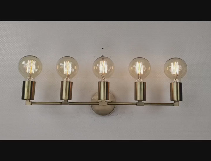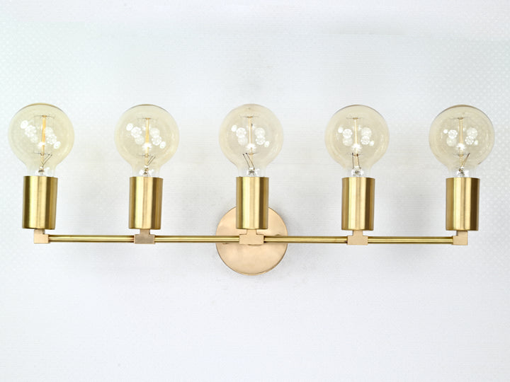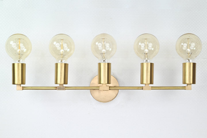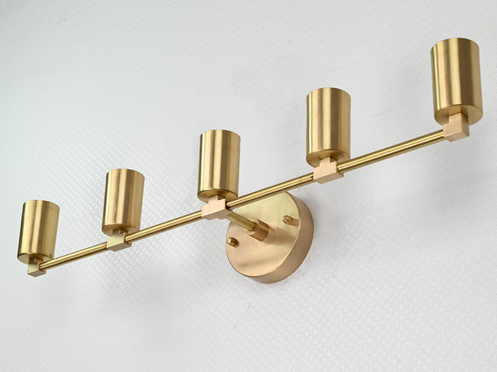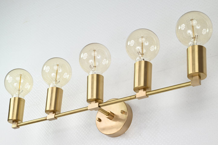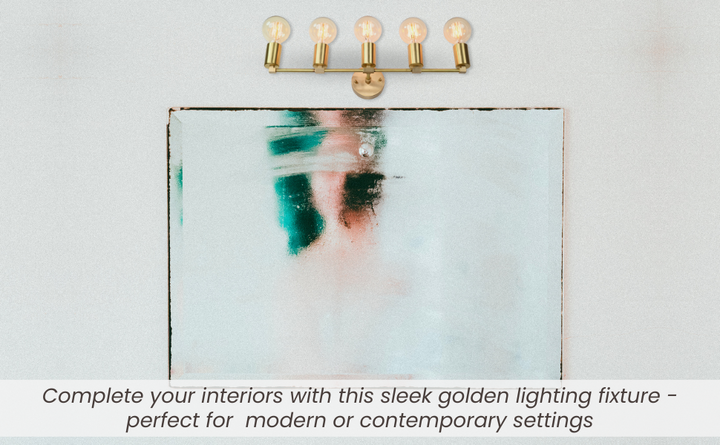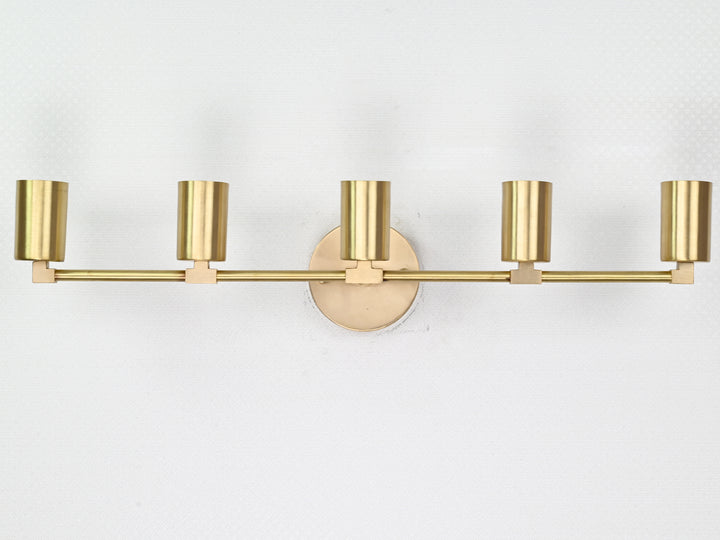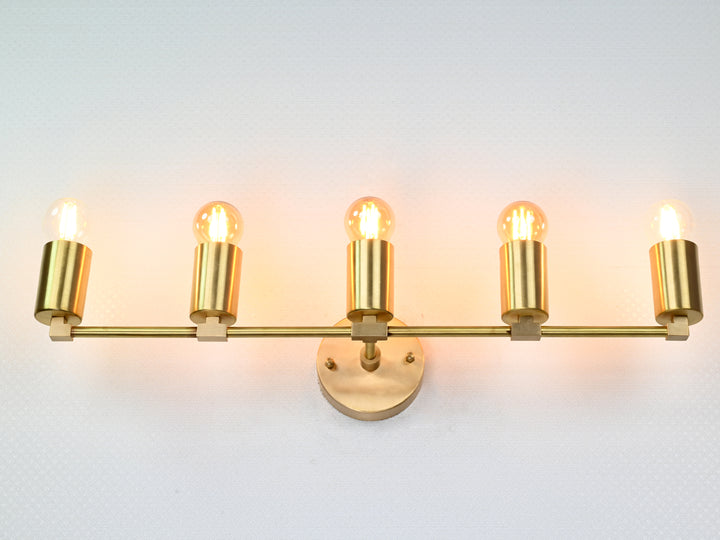 Crafted with precision from solid brass, this wall sconce exemplifies timeless sophistication through its structured silhouette and refined detailing. Measuring 56.5 cm (22.2 inches) in width and 13 cm (5 inches) in height, the fixture balances proportion and impact, offering an elongated form perfect for horizontal visual interest. The brushed brass finish lends a warm golden hue that enhances its luxe aesthetic, while five evenly spaced bulb holders create a rhythm of symmetry and clarity. When illuminated, the fixture produces a clean, ambient glow ideal for both task and mood lighting, elevating the atmosphere of any space. Whether mounted above a bathroom vanity, gracing a hallway gallery wall, or illuminating a dining nook, it adds a touch of modern refinement. Pair with Edison-style bulbs for a nostalgic twist or minimalist LED globes to emphasize its contemporary edge.