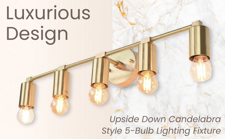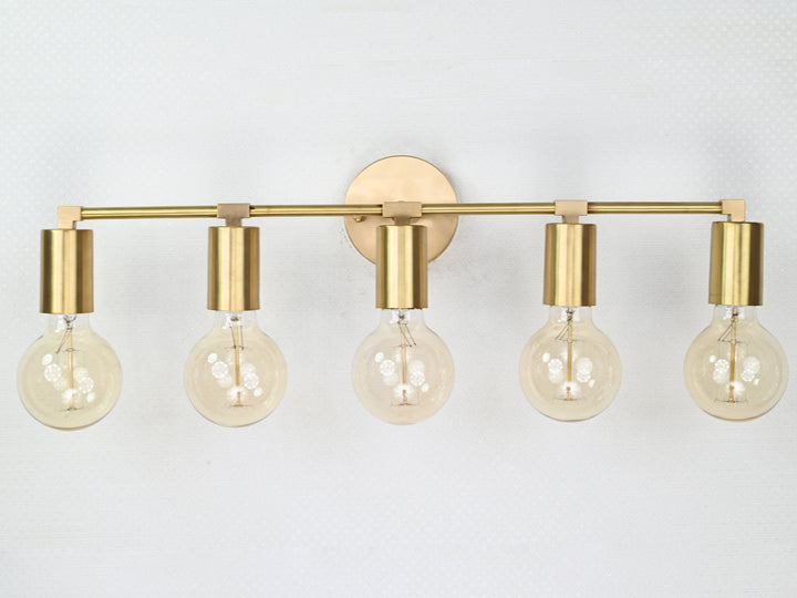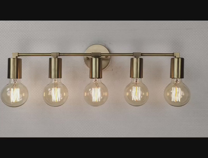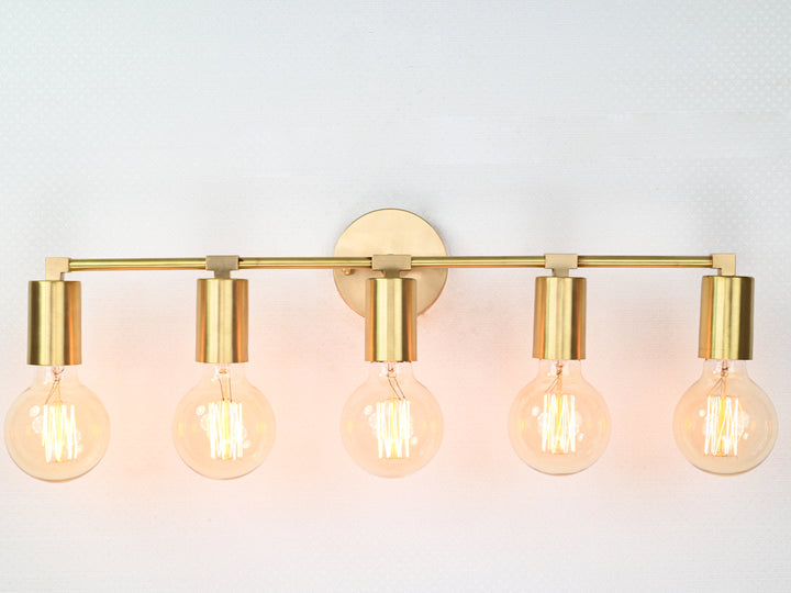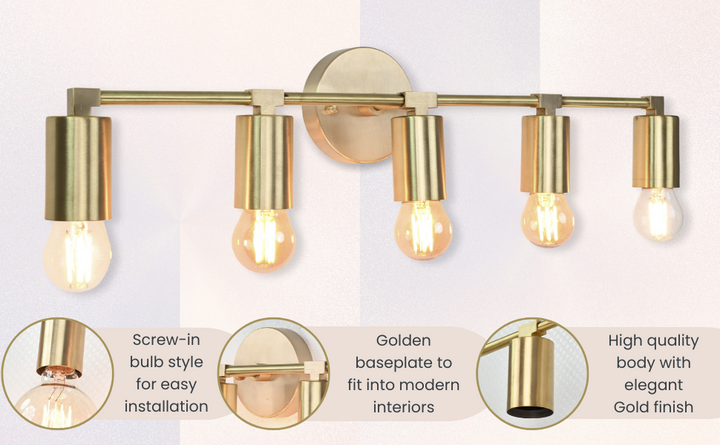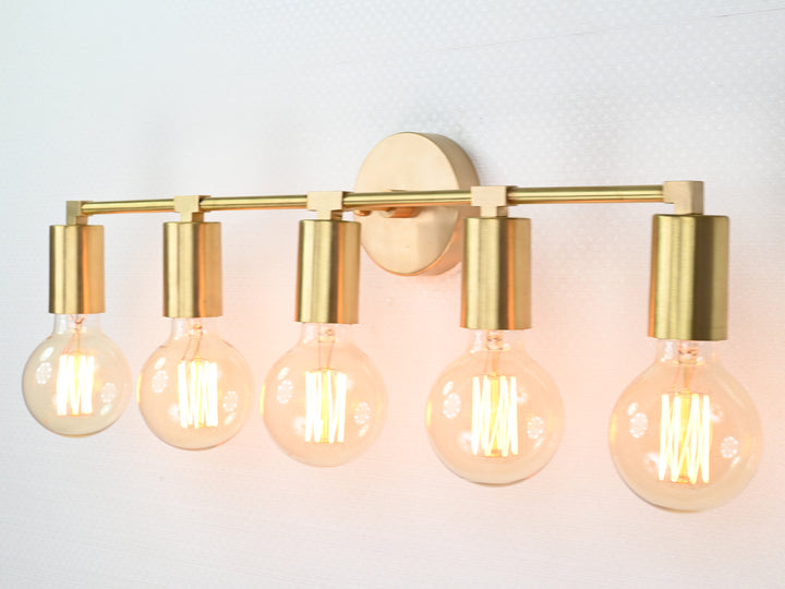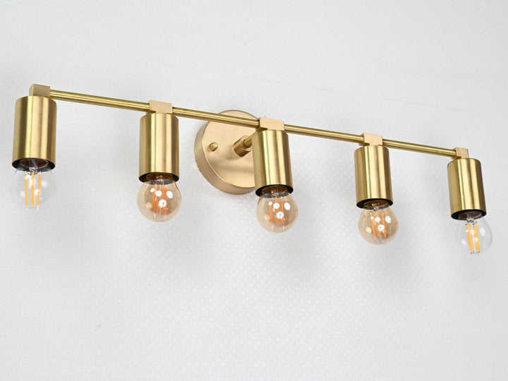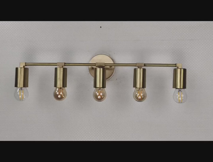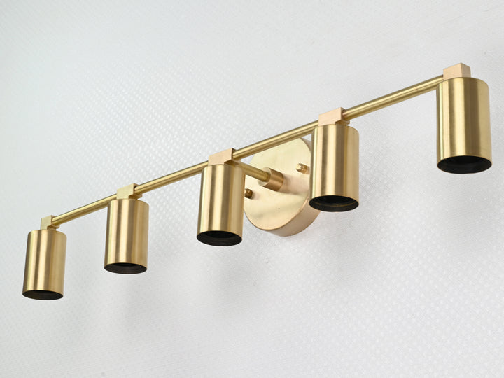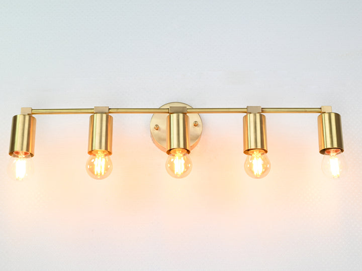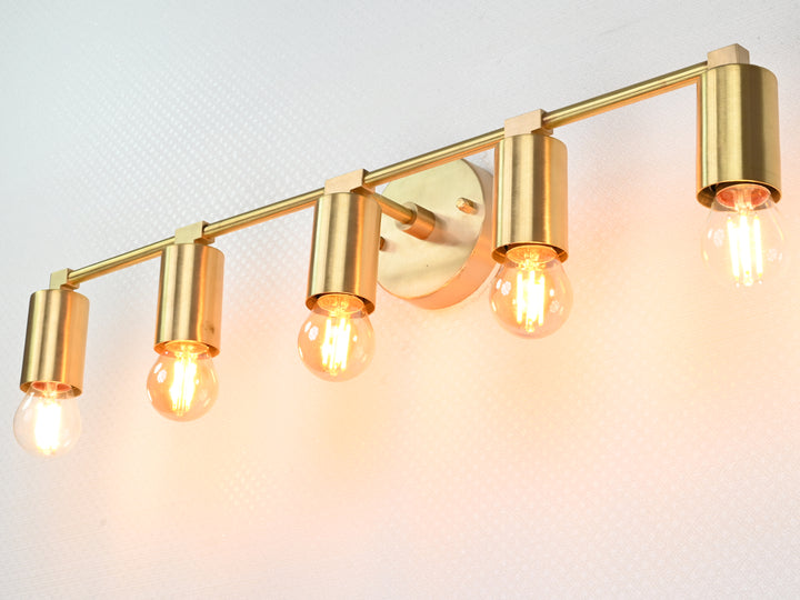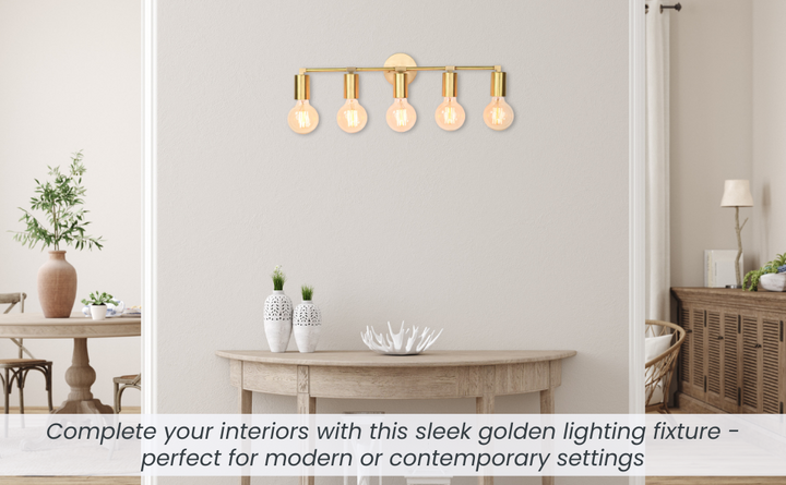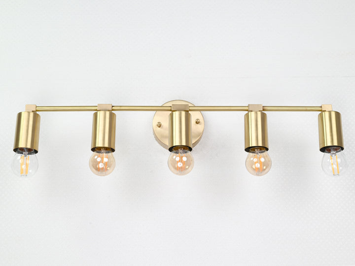 Crafted with precision from solid brass, this wall sconce exemplifies timeless sophistication through its structured silhouette and refined detailing. Measuring 56.5 cm (22.2 inches) in width and 13 cm (5 inches) in height, the fixture balances proportion and impact, offering an elongated form perfect for horizontal visual interest. The brushed brass finish lends a warm golden hue that enhances its luxe aesthetic, while five evenly spaced bulb holders create a rhythm of symmetry and clarity. When illuminated, the fixture produces a clean, ambient glow ideal for both task and mood lighting, elevating the atmosphere of any space. Whether mounted above a bathroom vanity, gracing a hallway gallery wall, or illuminating a dining nook, it adds a touch of modern refinement. Pair with Edison-style bulbs for a nostalgic twist or minimalist LED globes to emphasize its contemporary edge.