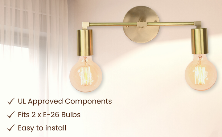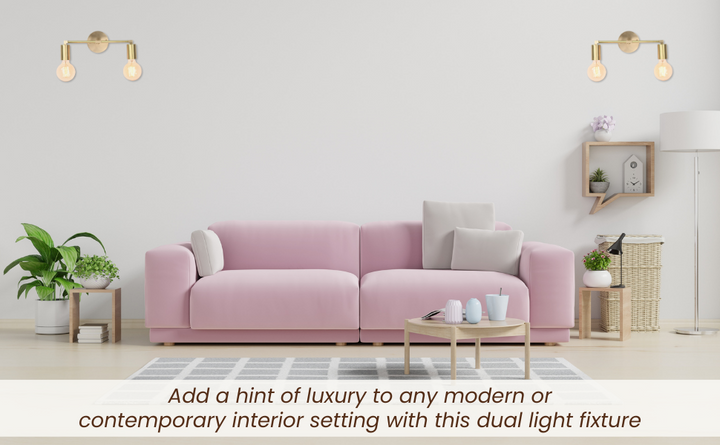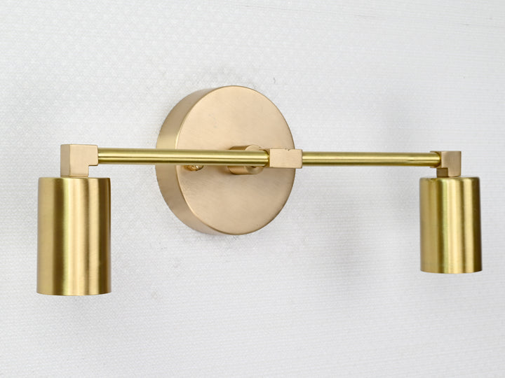 Minimal in footprint yet bold in expression, this two-light wall sconce is crafted from solid brass and finished in a soft brushed gold tone. Measuring 32.5 cm (13 inches) in width and 12 cm (5 inches) in height, it features clean cylindrical bulb holders mounted on a streamlined horizontal arm. The compact design makes it a perfect choice for small spaces or paired installations, while still delivering strong visual impact through its geometric form and warm metallic finish. With its lightweight build (0.47 kg / 1.03 lbs), it’s easy to install in bathrooms, entryways, or flanking mirrors and artwork. The cylindrical sockets are designed to complement Edison-style or globe bulbs, casting a soft ambient light that enhances both form and function. This fixture bridges classic brass elegance with contemporary minimalism, making it a versatile addition to modern interiors.