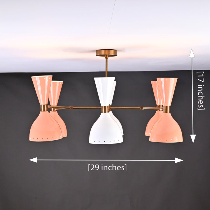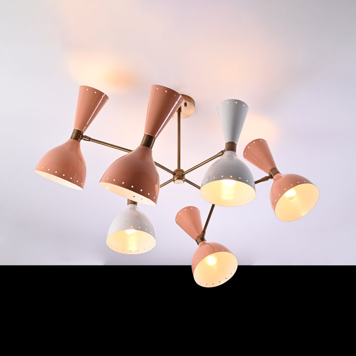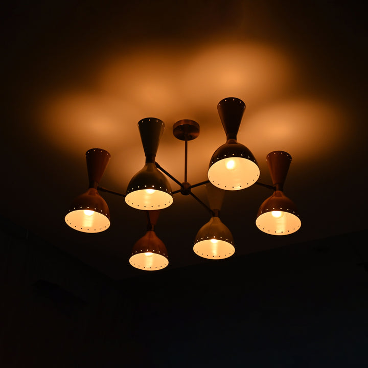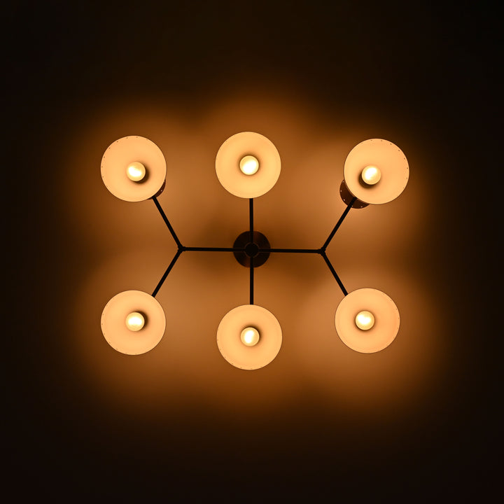 Introduce a bold mid-century modern statement to your interiors with this Diabolo-style ceiling light fixture, featuring a distinctive 6-arm configuration and a total of 12 lights. Each arm is fitted with dual conical shades, designed to project light both upward and downward, offering a unique two-way lighting effect that delivers both ambient and direct illumination. This fixture creates an exceptional visual impact, especially in dark room settings, where the lighting design casts dramatic glows and circular shadows across the ceiling, enhancing the mood and depth of the space. With an overall width of 29 inches and a height of 17 inches, this lighting piece is thoughtfully proportioned to stand out without overwhelming your space. Ideal for contemporary dining areas, living rooms, or any setting in need of a bold and functional lighting centerpiece.