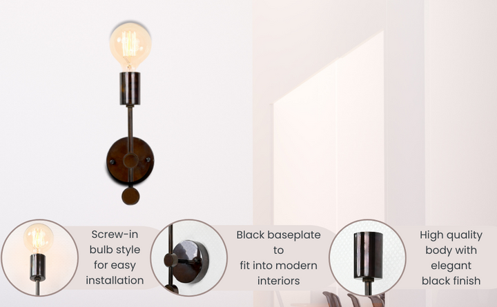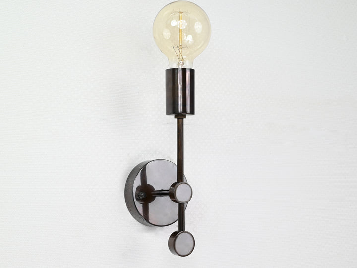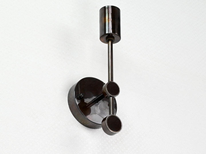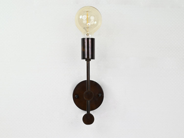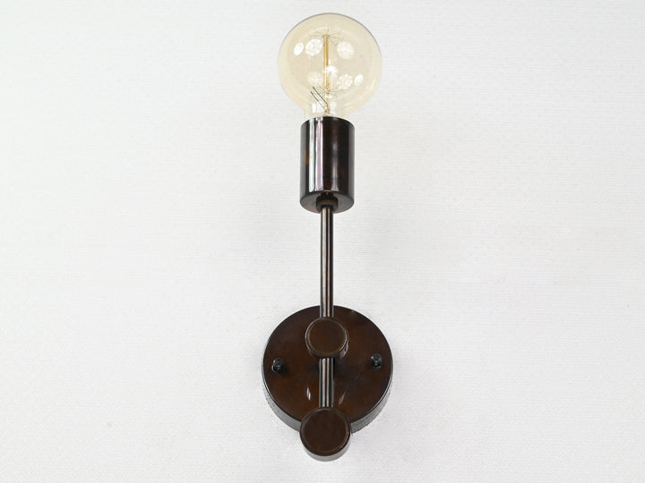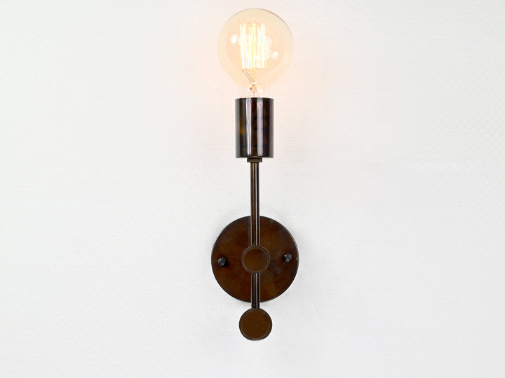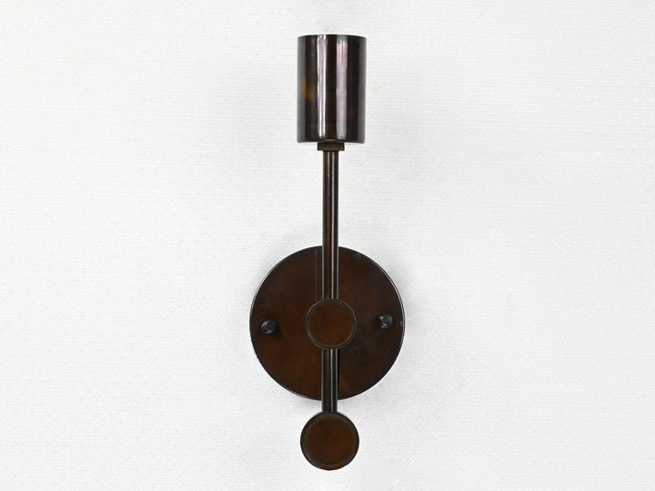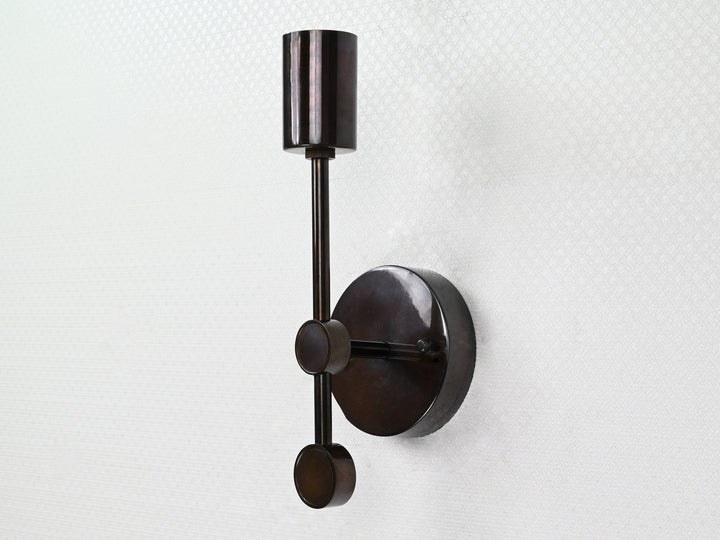 Defined by its sculptural simplicity and vintage-inspired charm, this vertical single-light wall sconce is handcrafted from solid brass and finished in a rich, dark patina. Measuring 25.5 cm (10 inches) in height and 9.6 cm (4 inches) in width, the fixture features a slim, vertical rod with geometric accents that subtly echo Bauhaus influences. The cylindrical bulb holder sits confidently atop the composition, offering a clean yet dramatic silhouette. Despite its compact footprint and lightweight build (0.38 kg / 0.83 lbs), the piece brings a strong architectural presence to any wall it graces. Ideal for narrow spaces, bedside lighting, or flanking a mirror, it casts a warm and focused glow when paired with an Edison-style bulb. This sconce blends artisanal craftsmanship with modernist lines, creating a timeless statement suited for both contemporary and classic interiors.