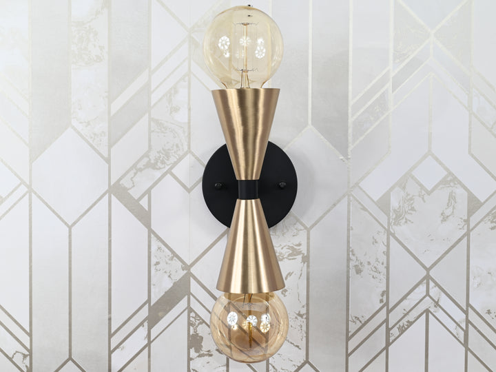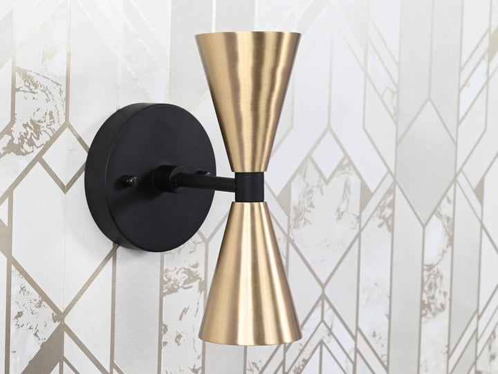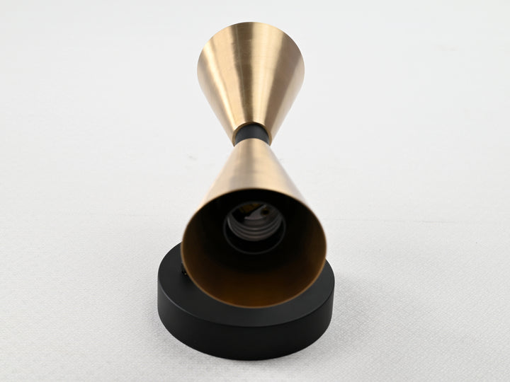 This refined wall sconce merges sculptural simplicity with timeless elegance, showcasing a sleek hourglass silhouette framed by a matte black base. Meticulously crafted from high-grade brass, the piece exudes both durability and upscale sophistication. The dual-cone design, finished in warm, brushed brass, creates a dynamic visual tension that’s both minimalist and bold. Measuring 20.3 cm (8 inches) in height and 10.4 cm (4.1 inches) in width, this compact fixture delivers ambient lighting while preserving a clean, architectural profile. Ideal for hallways, bedrooms, or contemporary living spaces, it adds a curated touch of mid-century modern charm with a modern twist.