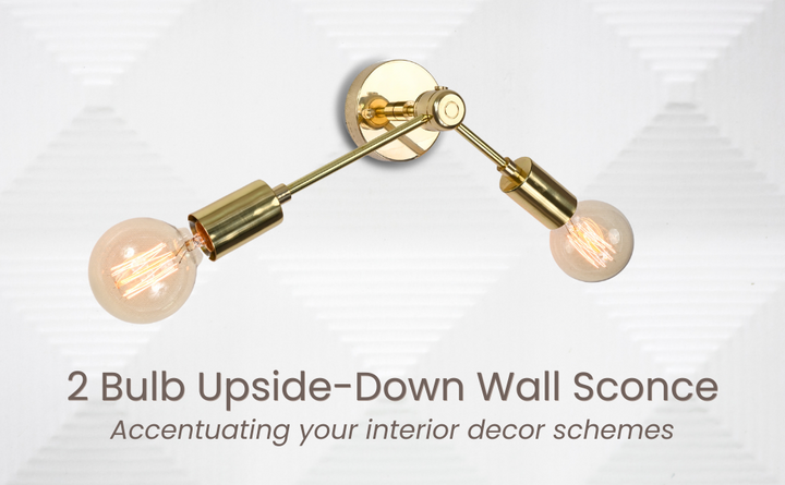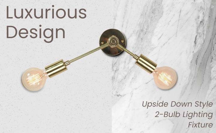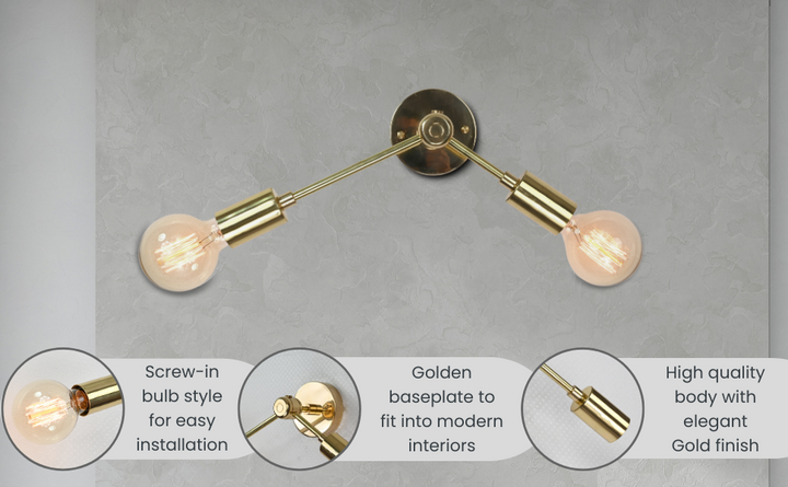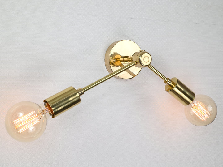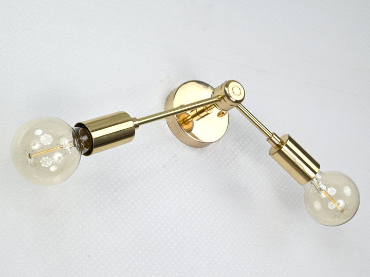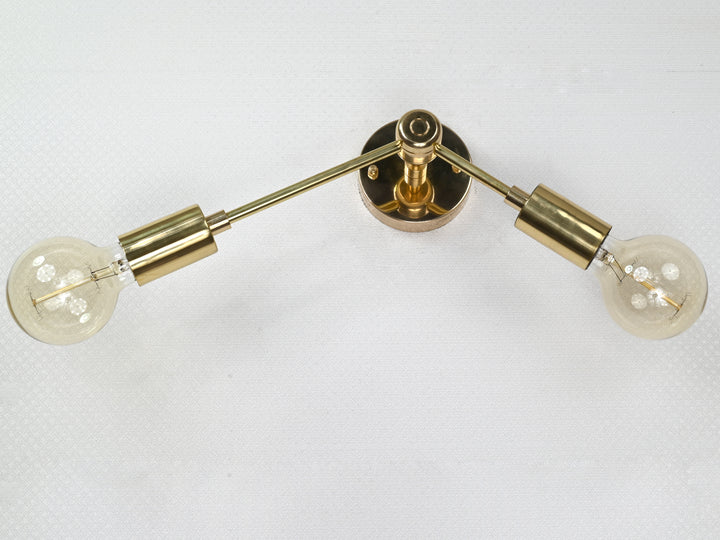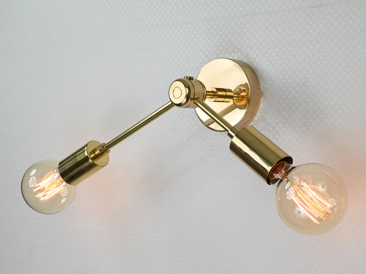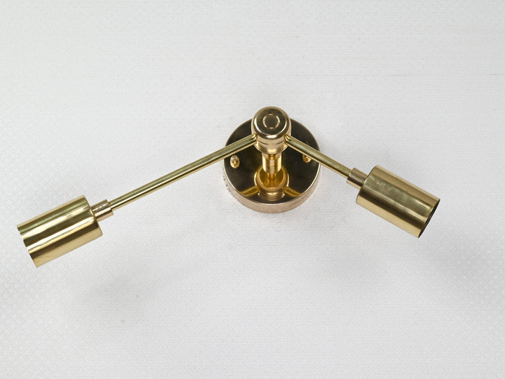 Expertly crafted from solid brass with a polished finish, this two-light wall sconce blends classic craftsmanship with adjustable modern functionality. Measuring 38 cm (15 inches) in width and 18 cm (7 inches) in height, the fixture features pivoting arms that allow the light direction to be easily customized. Each cylindrical socket sits at the end of an angled arm, radiating from a central round mounting plate that adds symmetry and visual cohesion. Its lightweight construction (0.59 kg / 1.29 lbs) and articulating form make it a versatile option for directional lighting—whether you're highlighting artwork, illuminating a workspace, or framing a mirror. The polished brass finish enhances its timeless appeal while reflecting surrounding light to create a warm and inviting glow. Pair it with vintage filament or globe LED bulbs to complement its refined geometry and maximize both style and brightness.