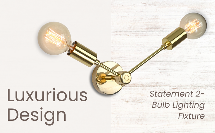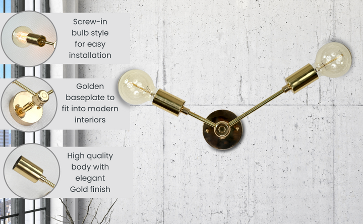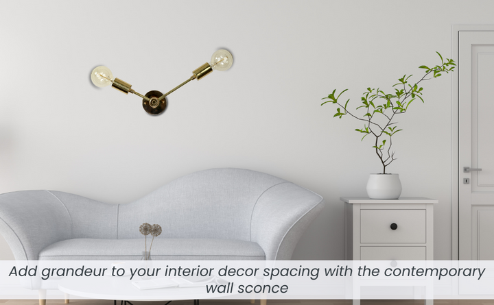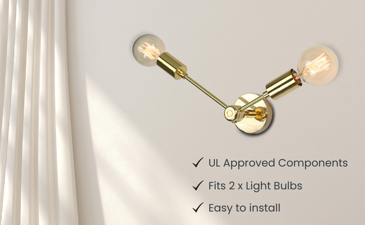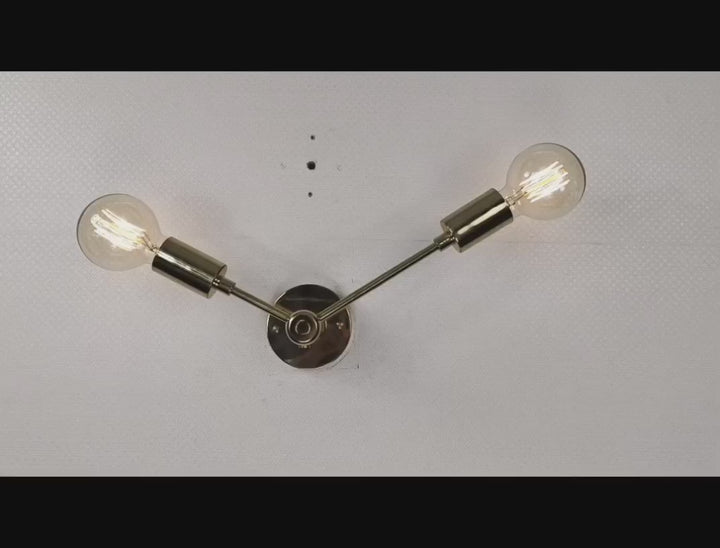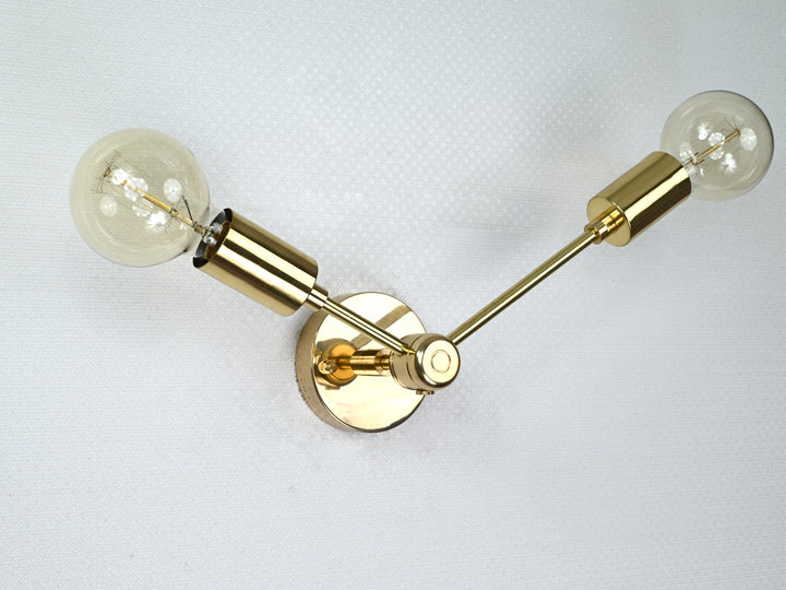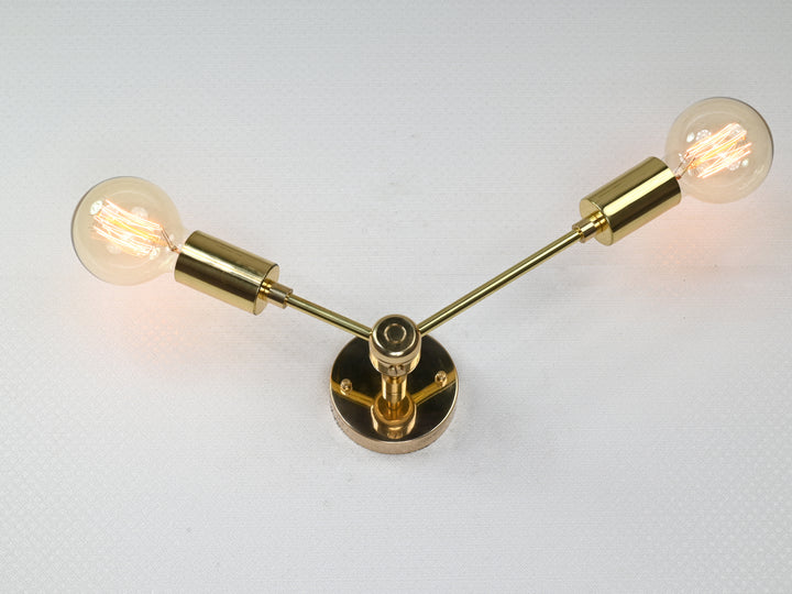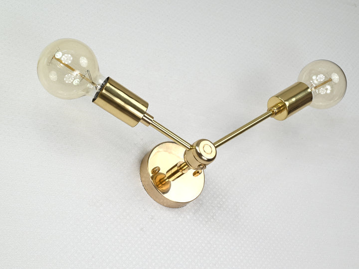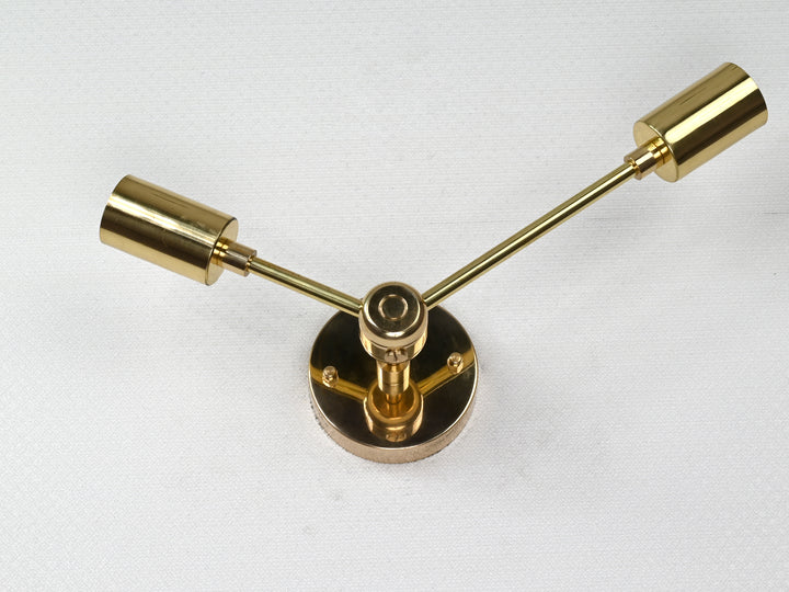 Expertly crafted from solid brass with a polished finish, this two-light wall sconce blends classic craftsmanship with adjustable modern functionality. Measuring 38 cm (15 inches) in width and 18 cm (7 inches) in height, the fixture features pivoting arms that allow the light direction to be easily customized. Each cylindrical socket sits at the end of an angled arm, radiating from a central round mounting plate that adds symmetry and visual cohesion. Its lightweight construction (0.59 kg / 1.29 lbs) and articulating form make it a versatile option for directional lighting—whether you're highlighting artwork, illuminating a workspace, or framing a mirror. The polished brass finish enhances its timeless appeal while reflecting surrounding light to create a warm and inviting glow. Pair it with vintage filament or globe LED bulbs to complement its refined geometry and maximize both style and brightness.