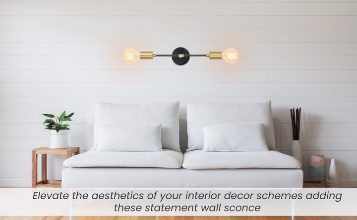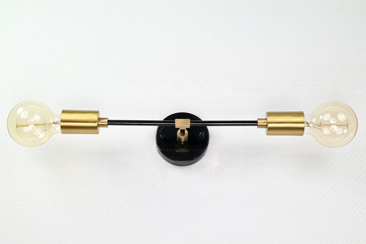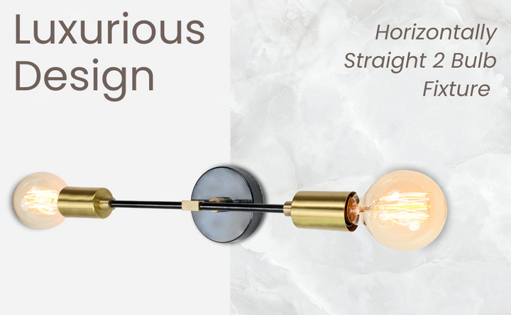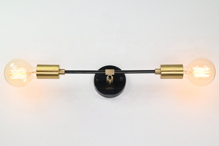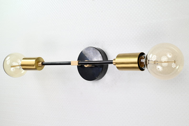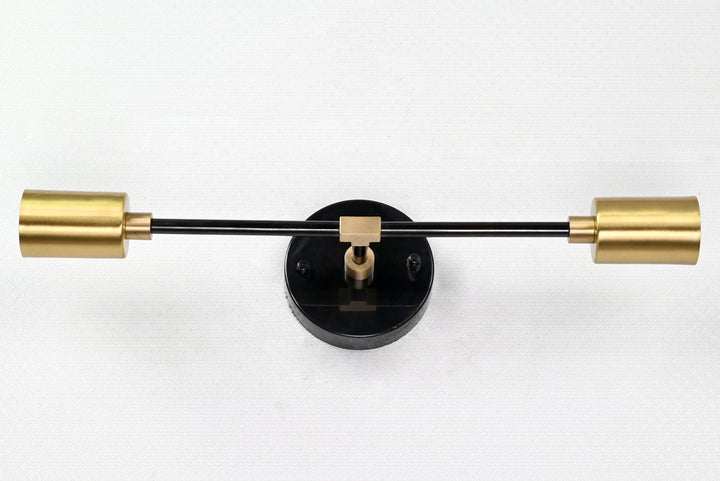 A contemporary take on industrial elegance, this two-light wall sconce is constructed from solid brass and finished in a striking dual-tone palette. The fixture spans 40.6 cm (16 inches) in width and 9.6 cm (4 inches) in height, with a sleek black center rod anchoring two brushed brass cylindrical sockets. Its compact design and lightweight build (0.48 kg / 1.06 lbs) make it an easy yet impactful choice for smaller spaces or layered lighting concepts. The high-contrast materials—matte black and warm brass—introduce depth and dimension to the design, making it a standout addition whether mounted above a mirror, flanking a bed, or lighting up a hallway. When paired with Edison or globe bulbs, the sconce casts a warm, ambient glow that enhances the surrounding textures and tones. Designed to balance form and function, it seamlessly blends into both minimalist and mixed-metal interior palettes.