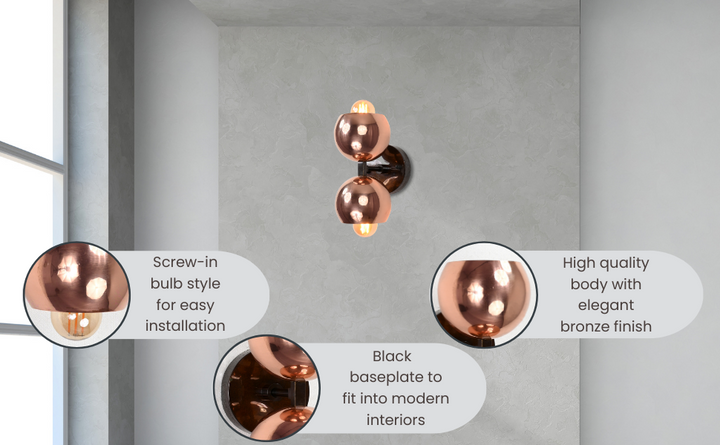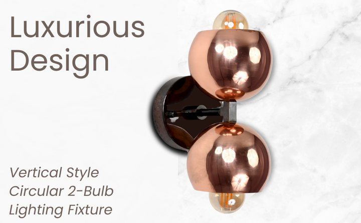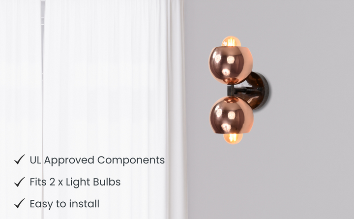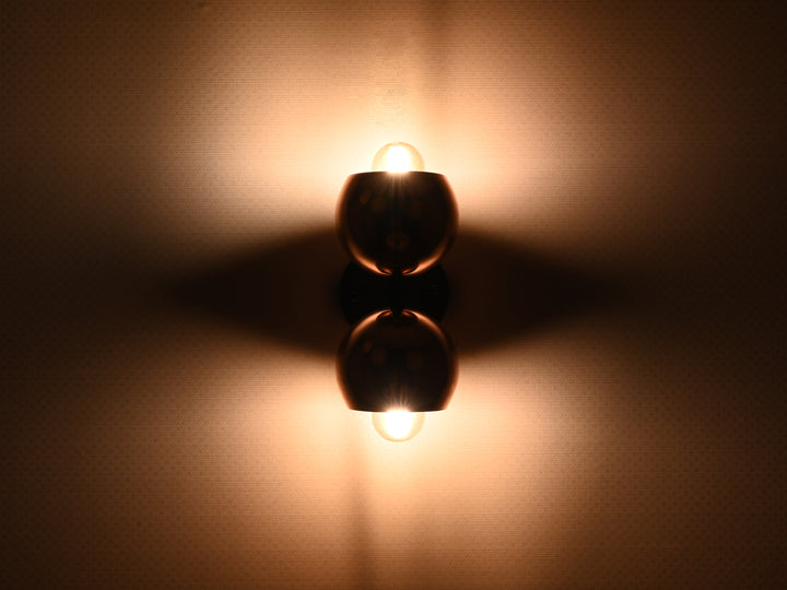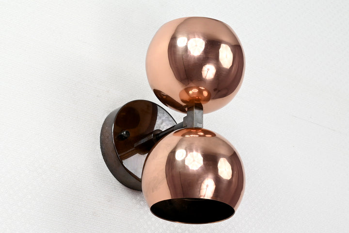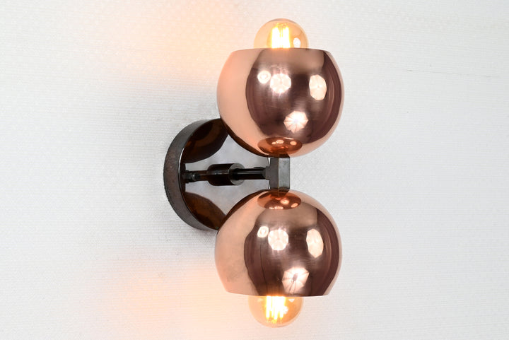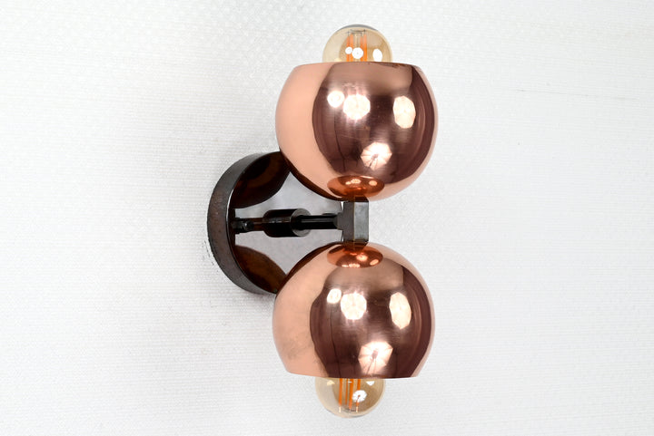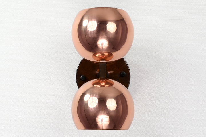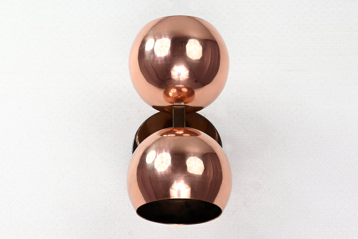 Sculptural and bold, this double-dome wall sconce is a striking design piece crafted entirely from solid brass with a high-gloss copper-toned finish. Measuring 20 cm (8 inches) in height and 10.5 cm (4 inches) in width, its vertically stacked hemispheres create a commanding form that delivers both ambient and directional light. The polished surfaces reflect their surroundings with a mirror-like sheen, adding depth and dimension to any wall it graces. Weighing 0.79 kg (1.73 lbs), the fixture feels substantial without being heavy. Designed to house two bulbs—one up-facing and one down-facing—it creates a balanced play of light, ideal for flanking mirrors, accentuating feature walls, or serving as dramatic hallway lighting. With its retro-futuristic vibe and luxe materiality, this sconce is a bold statement for modern interiors that lean into glamour, geometry, and expressive metallics.