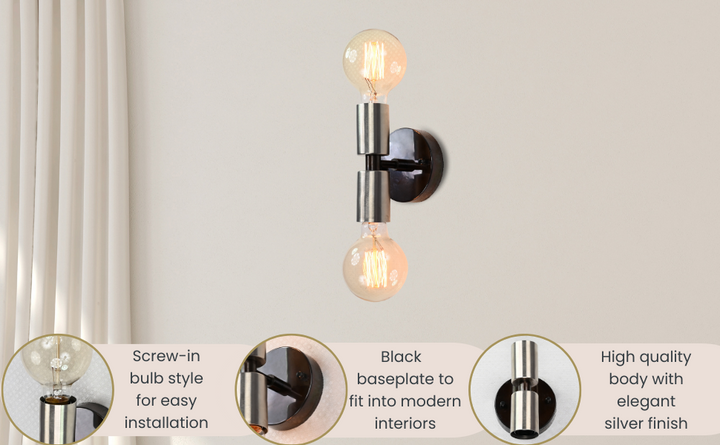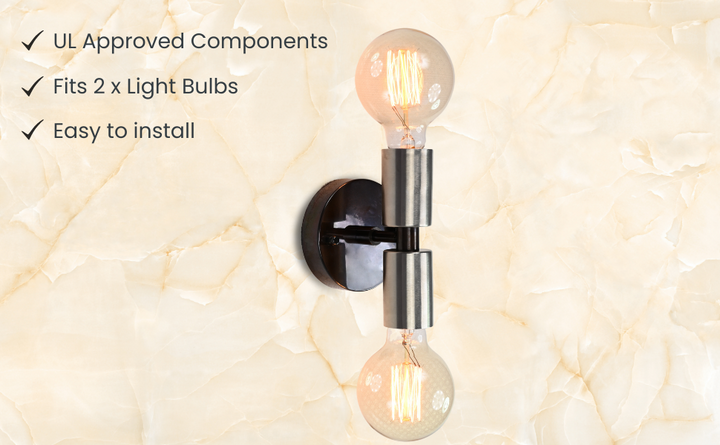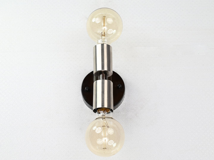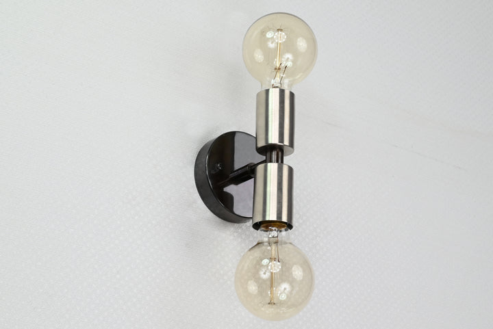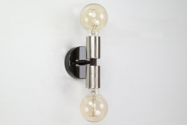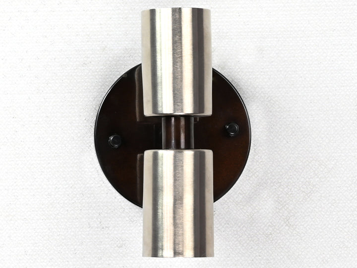 This vertical two-light wall sconce is a refined blend of industrial strength and minimalist geometry. Constructed from solid brass and finished with a brushed nickel tone over a dark patina base, the fixture stands at 14.3 cm (6 inches) in height and 9.6 cm (4 inches) in width. Two cylindrical sockets—positioned above and below a central rod—offer a balanced design that delivers upward and downward illumination, perfect for mood or accent lighting. Despite its compact profile and lightweight build (0.38 kg / 0.84 lbs), the fixture offers substantial visual presence. Ideal for flanking mirrors, highlighting hallways, or creating vertical rhythm on accent walls, it brings clean lines and a subtle contrast of finishes. Pair with Edison bulbs for a vintage look or frosted globes for a soft, contemporary glow.
