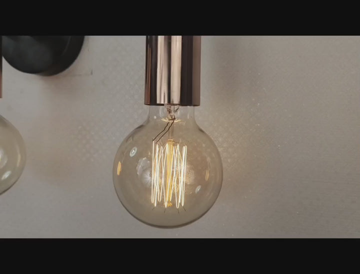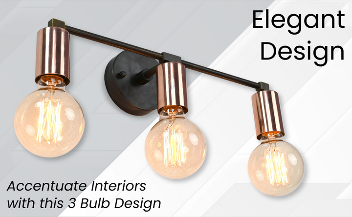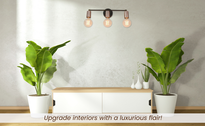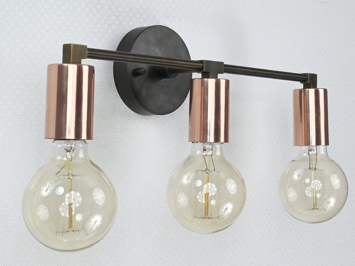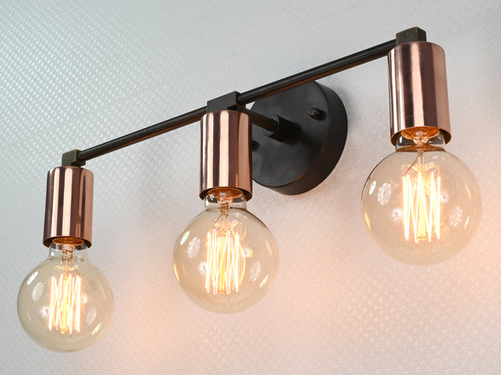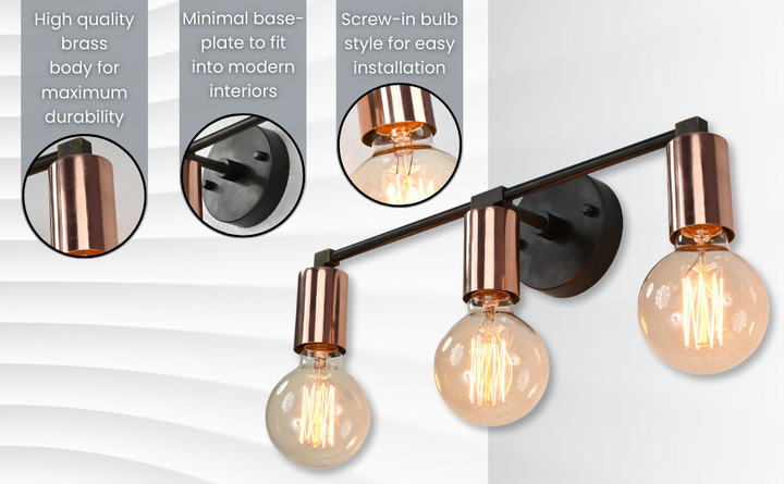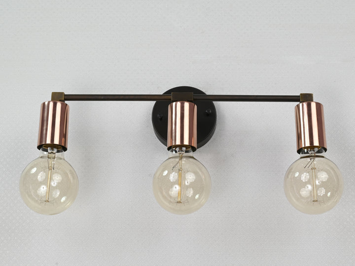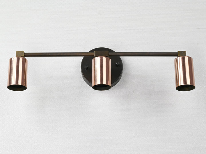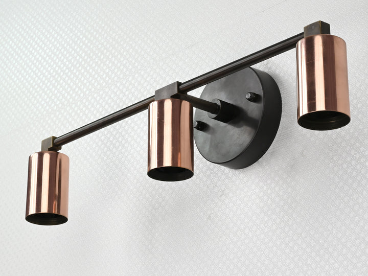 Refined yet bold, this three-light wall sconce features a sleek interplay of contrasting finishes and minimalist geometry. Crafted from solid brass, it pairs a matte black circular mount and arms with polished copper cylindrical sockets, creating a striking visual balance. The linear design and warm metallic tones bring depth and modern sophistication to any setting. Measuring 39.5 cm (16 inches) in width and 12.5 cm (5 inches) in height, this fixture is ideal for vanities, hallways, and contemporary accent walls. Whether used for ambient lighting or as a decorative centerpiece, it offers a clean, architectural silhouette and a timeless appeal. The juxtaposition of materials makes it perfect for interiors that lean modern, industrial, or mid-century.