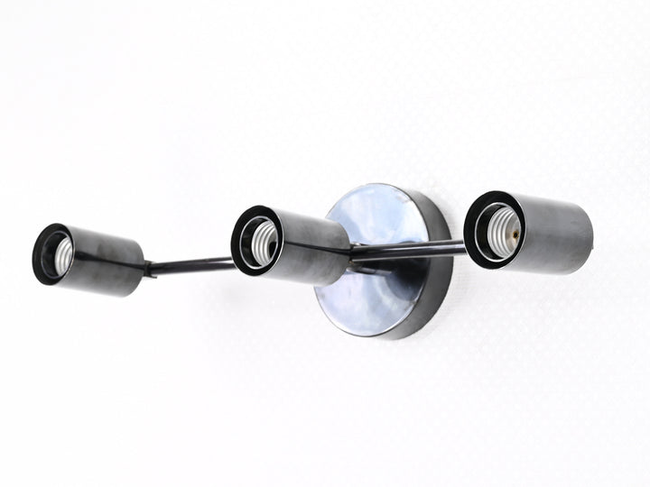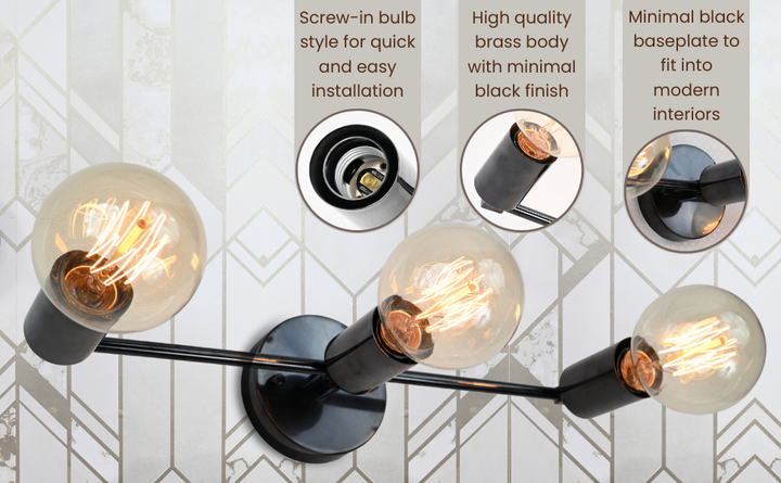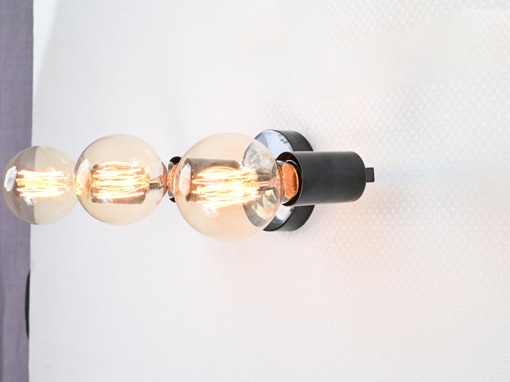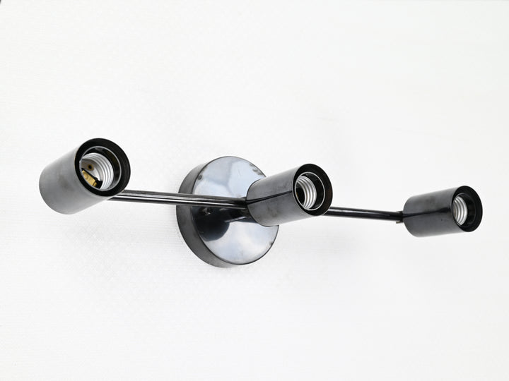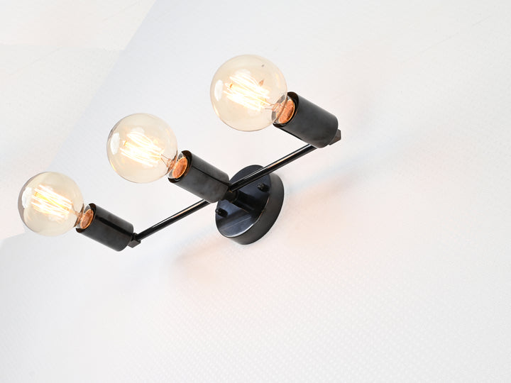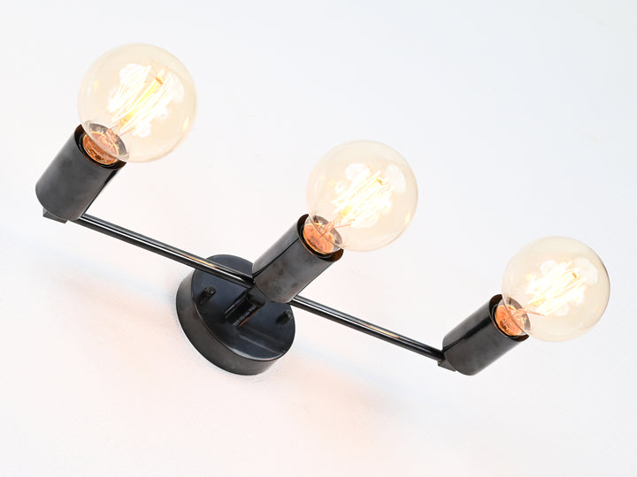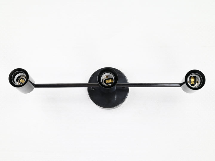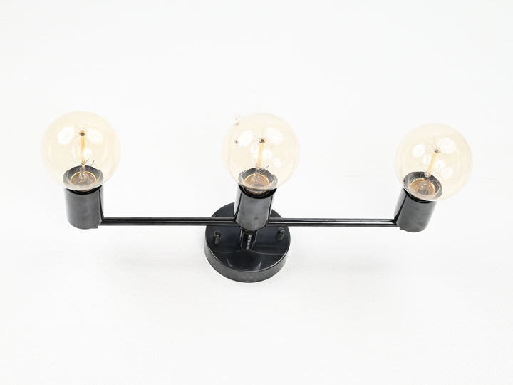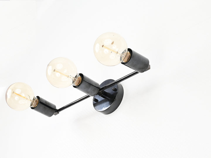 Streamlined and modern, this triple-light wall sconce features a refined silhouette that balances clean geometry with industrial sophistication. Handcrafted from solid brass and finished in a deep, polished black, the fixture is composed of a horizontal bar with three cylindrical sockets—delivering symmetrical elegance and ambient illumination with a subtle architectural flair. Measuring 40 cm (16 inches) in width and 9.6 cm (3.7 inches) in height, it offers a compact yet impactful lighting solution ideal for vanities, hallways, or accent walls. Its bold black finish adds a dramatic touch while allowing versatility across a variety of interior aesthetics—from modern lofts to minimalist settings. Functional yet artful, this sconce is the perfect choice for those who appreciate elevated, contemporary lighting.