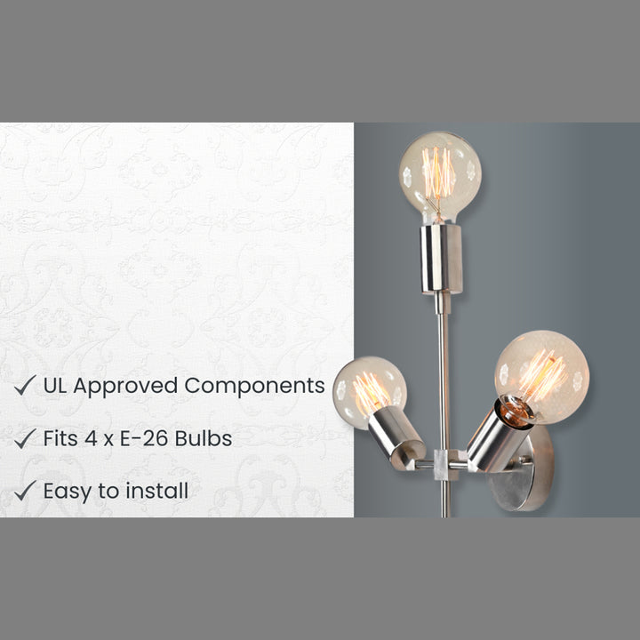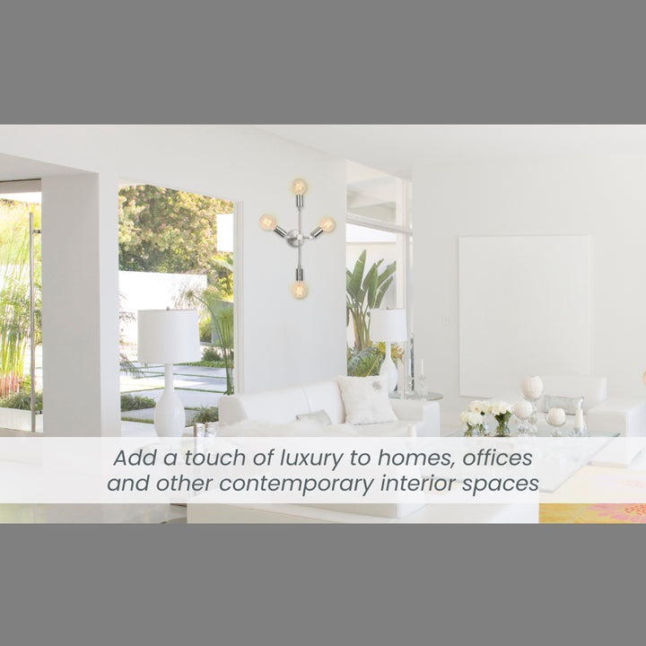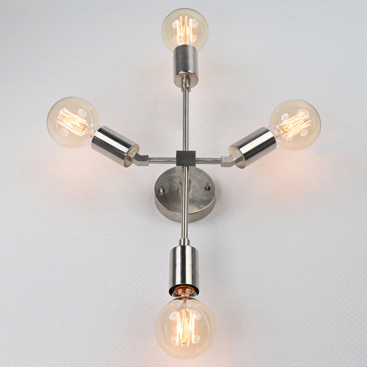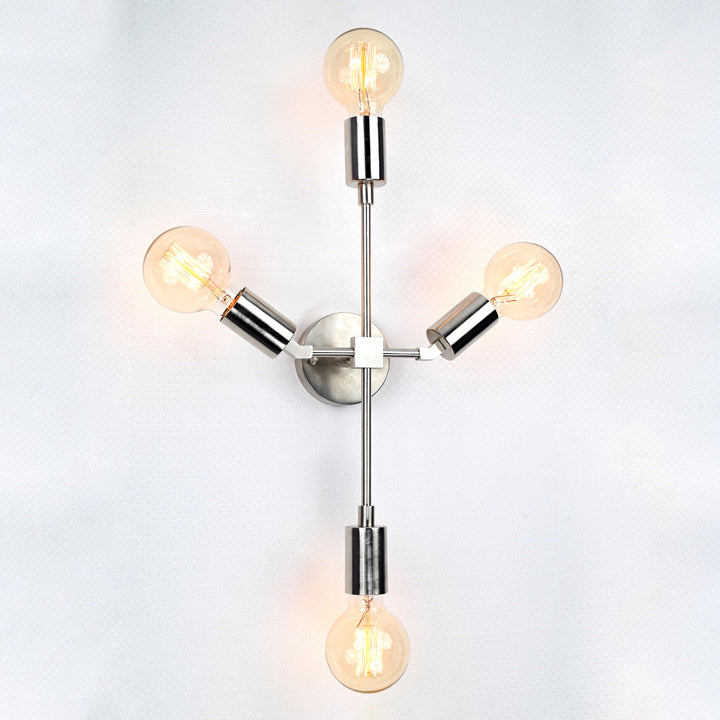 Elevate your interiors with this radiant four-light wall sconce, where contemporary elegance meets structured symmetry. Precision-crafted from high-quality brass with a polished finish, this fixture features a bold vertical axis intersected by a horizontal arm, forming a modern cruciform design. Each of the four cylindrical sockets extends outward to cradle exposed bulbs, offering a luminous display of ambient light with architectural presence. Measuring 45.5 cm (18 inches) in height and 28 cm (11 inches) in width, this piece offers an eye-catching, space-conscious solution for hallways, living rooms, entryways, or creative studios. Its sleek metallic finish adds a sophisticated edge while reflecting light beautifully across surrounding surfaces. Designed to balance form and function, this wall sconce is ideal for interiors seeking a refined, contemporary focal point with sculptural depth and visual intrigue.