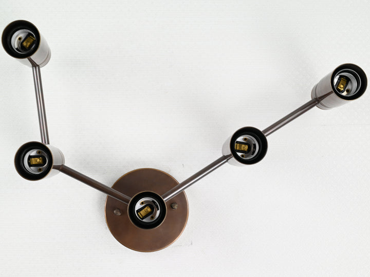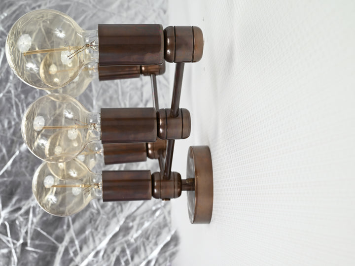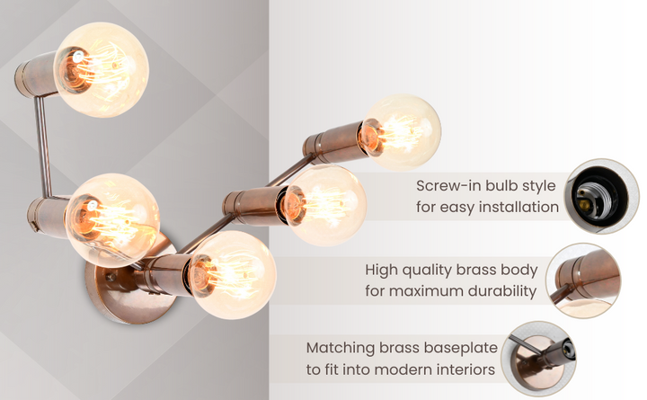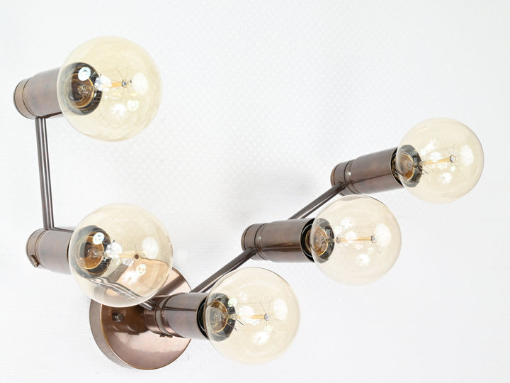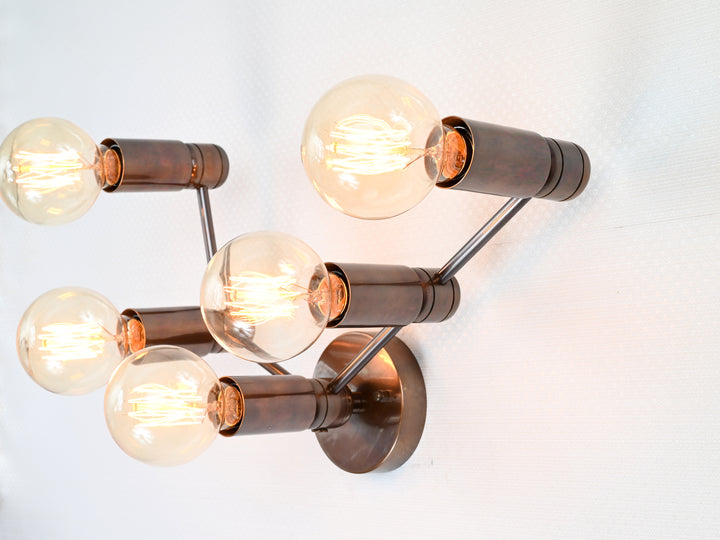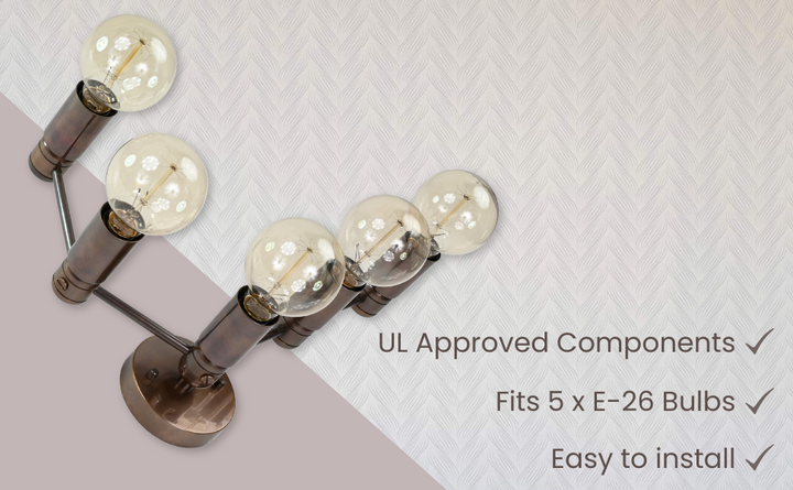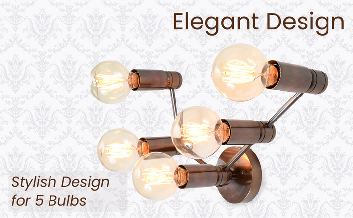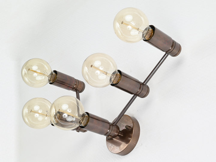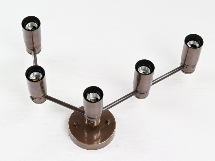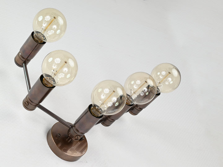 Make a bold design statement with this five-light wall sconce, blending classic structure with modern edge. Crafted from solid brass and finished in a deep antique tone, this piece features a horizontal bar with five upward-facing cylindrical sockets, creating a beautifully symmetrical, branch-like silhouette. The warm patina of the brass adds richness and character, making it a sophisticated choice for curated interiors. Measuring 40 cm (16 inches) in width and 25 cm (10 inches) in height, this fixture delivers balanced, ambient lighting—ideal for vanities, accent walls, or hallways. The combination of vintage finish and geometric layout evokes both mid-century sensibility and industrial charm. Whether used alone or paired in a series, this fixture transforms any setting into a gallery of refined style.