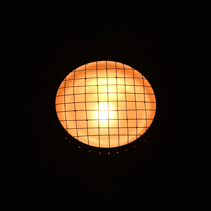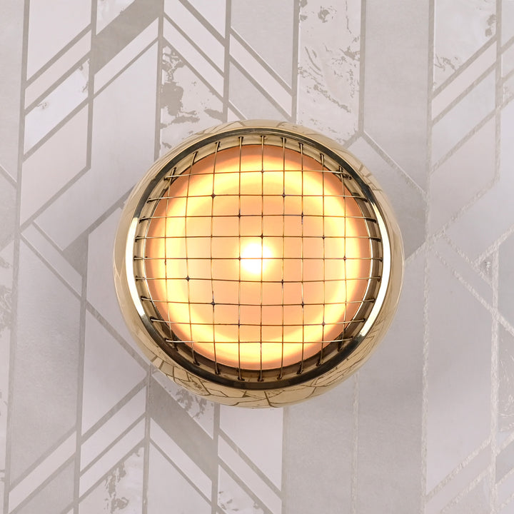 • BOWL SHAPED INDUSTRIAL WALL FLUSHMOUNT LIGHT FEATURING BRASS BODY AND METAL GRID MESH COVER