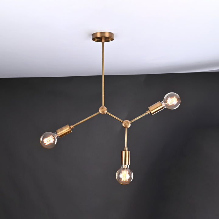 Modern 3-Light Antique Brass Chandelier – Asymmetrical Mid-Century Ceiling Fixture with Exposed Bulbs - 32202