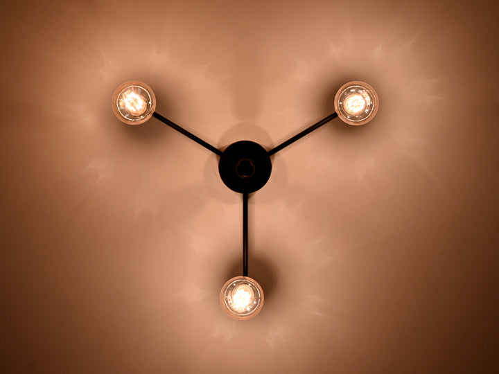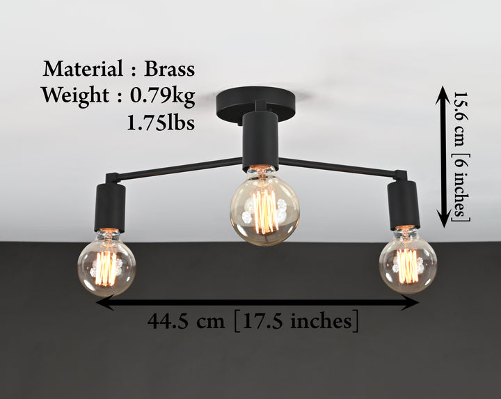 Exquisitely crafted from premium brass, this compact ceiling lamp embodies modern sophistication with a minimalist design. Featuring three elegantly spaced lights in a geometric arrangement, it delivers a harmonious spread of illumination while serving as a refined decorative accent. Measuring 44.5 cm (17.5 inches) in width and 15.6 cm (6 inches) in height, this understated fixture is ideally suited for intimate interiors such as bedrooms, corridors, or reading nooks. Its sleek profile and architectural charm make it a seamless addition to contemporary living spaces where subtle elegance is desired.