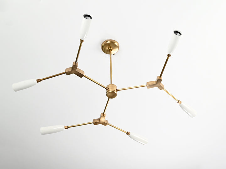 This striking ceiling light fixture features a modern, geometric design with a sophisticated blend of brass and white accents. Crafted from high-quality brass, the chandelier has a total of six lights, each extending from angular arms that branch out in a visually balanced layout. The fixture measures 95.5 cm (37.5 inches) in width and 35.8 cm (14 inches) in height, making it a perfect statement piece for living rooms, dining areas, or modern workspaces. It is both lightweight and durable, offering a sleek yet sturdy addition to contemporary interiors.
