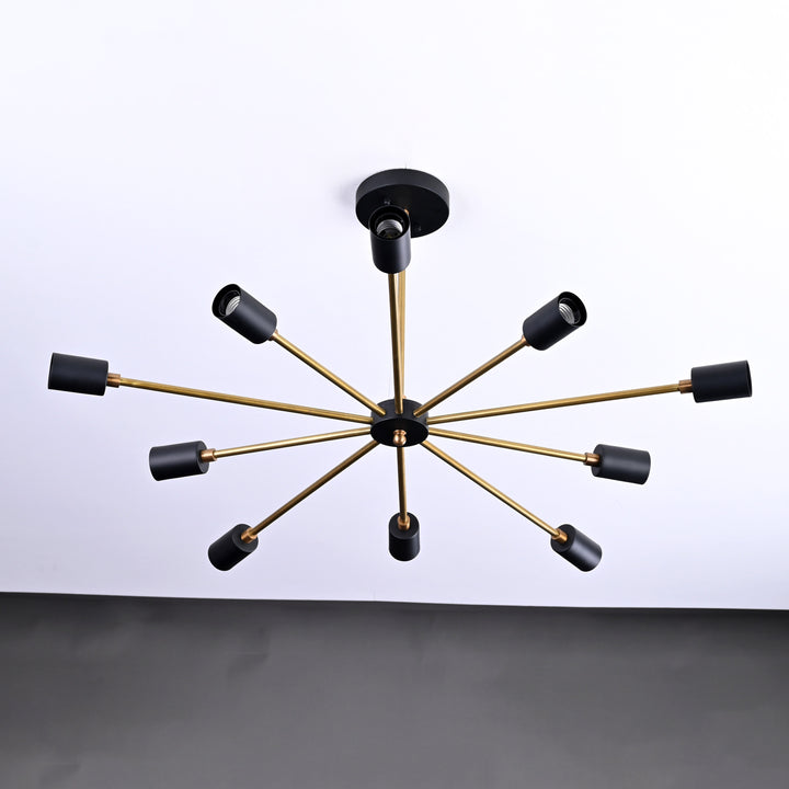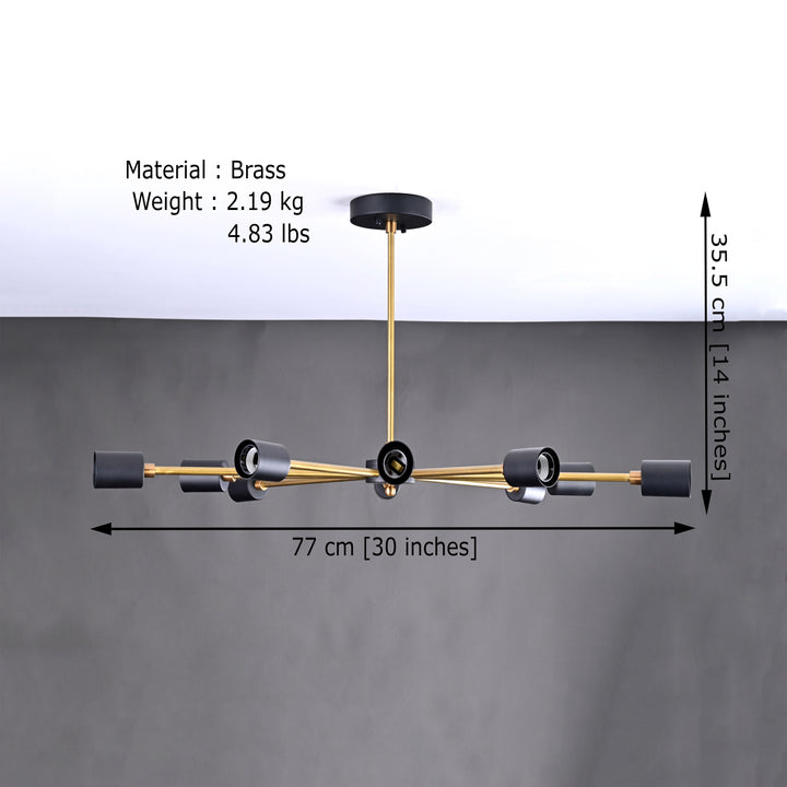 Elevate your interior with this exquisite modern chandelier, distinguished by its dynamic starburst silhouette. Featuring 10 symmetrically arranged arms extending from a central hub, it creates a harmonious blend of structure and style. Expertly crafted from premium brass and finished in a sophisticated combination of matte black and brass antique, this fixture embodies contemporary elegance. With dimensions of 77 cm (30 inches) in width and 35.5 cm (14 inches) in height, it serves as a striking focal point—ideal for dining areas, living rooms, or entryways.