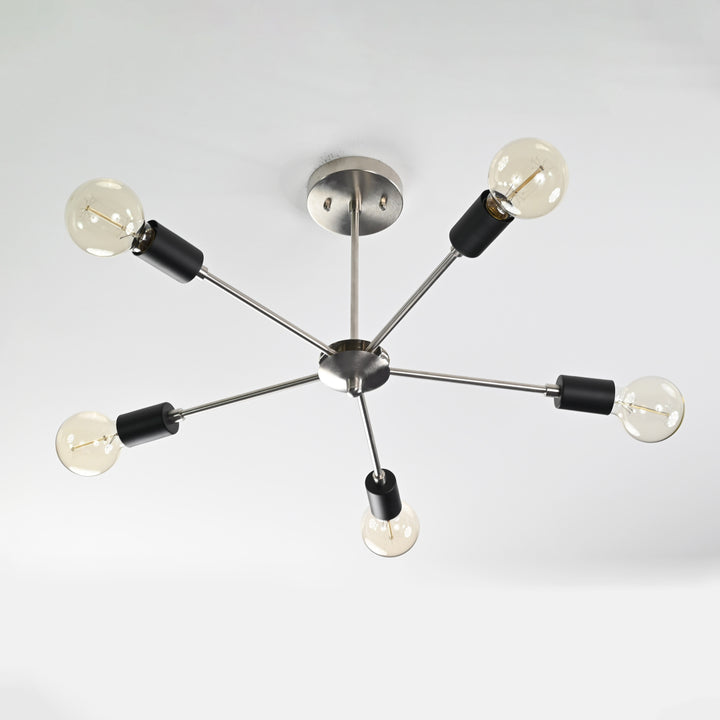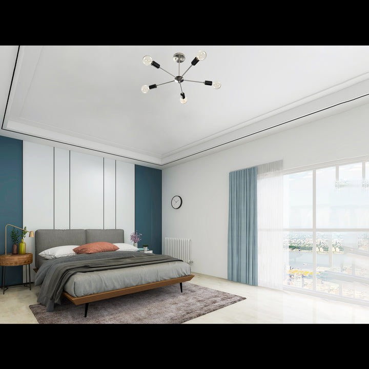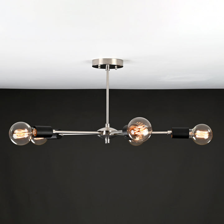Industrial 6-Light Brushed Nickel Sputnik Chandelier – Minimalist Ceiling Fixture with Black Accents - 32169