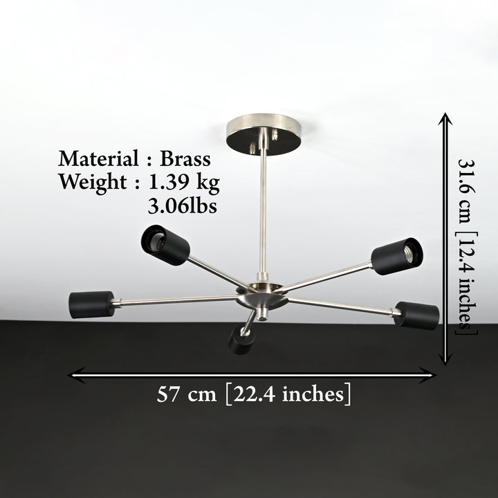This modern ceiling light fixture showcases a sleek and minimalist design, made from high-quality brass. It features five evenly spaced lights arranged in a striking starburst pattern, creating a bold and balanced look. The fixture measures 57 cm (22.4 inches) in width and extends 31.6 cm (12.4 inches) from the ceiling, making it an ideal centerpiece for living rooms, dining spaces, or contemporary office settings. Its clean lines and brushed metal finish offer a stylish touch to any interior décor.