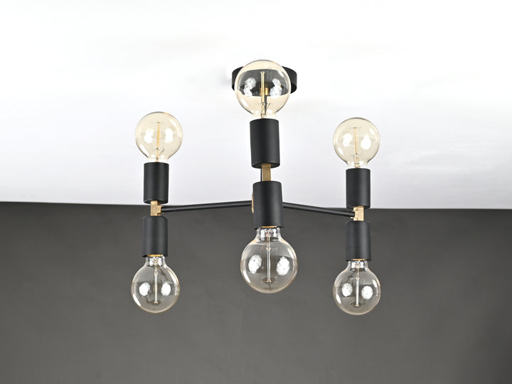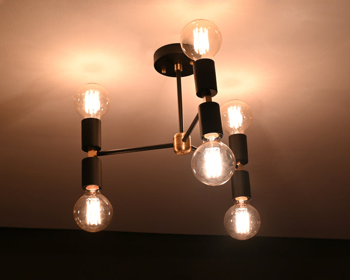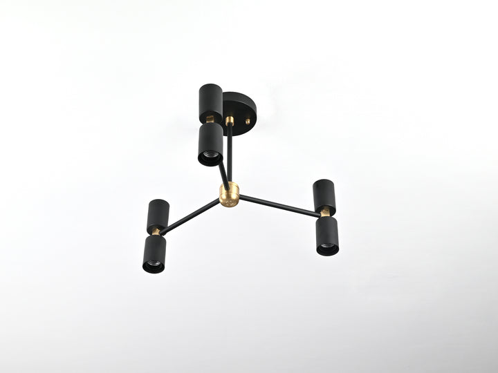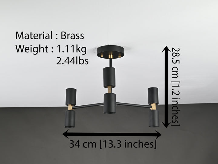 This contemporary ceiling light fixture is expertly crafted from premium brass with a sophisticated matte black finish and elegant gold-toned accents. It features a unique 3-arm design, each arm supporting dual light holders, totaling 6 lights. With dimensions of 34 cm (13.3 inches) in width and 28.5 cm (11.2 inches) in height, this stylish piece is ideal for adding a modern flair to living rooms, dining areas, or entryways while providing ample illumination.