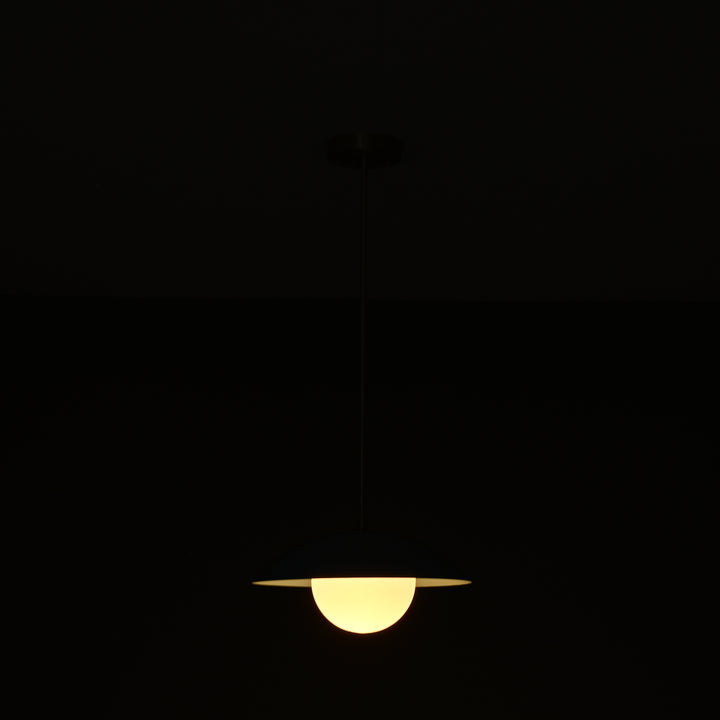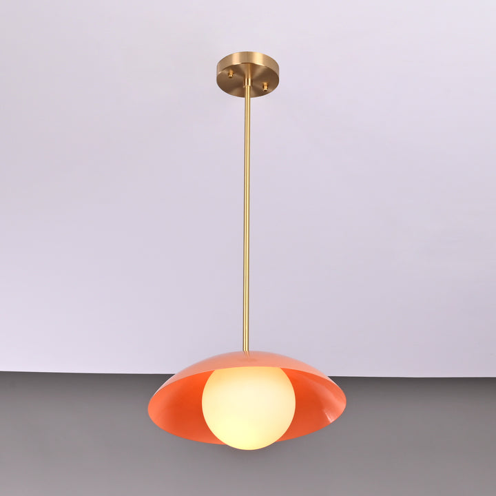 This modern pendant light features a sleek, minimalistic design with a semi-spherical shade that creates a striking visual presence from every angle. At the center, a smooth rounded diffuser is nestled within the shade, distributing light evenly for a soft and ambient glow. The internal globe enhances the overall light output, making it suitable for various settings such as dining areas, kitchens, or entryways. The pendant is supported by a streamlined brass rod structure that ensures a clean and stable suspension. With a diameter of 12 inches and a total height of 27 inches from ceiling to base, the fixture is well-proportioned for both single and grouped installations. Its sculptural form adds a touch of sophistication and modern elegance to any space.