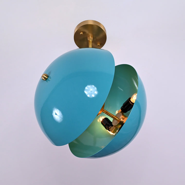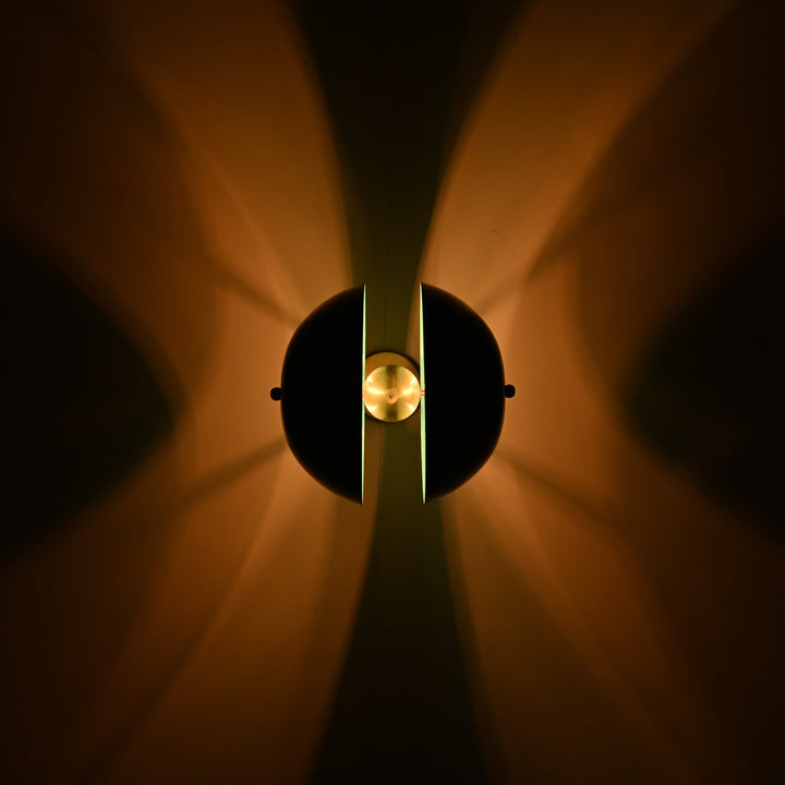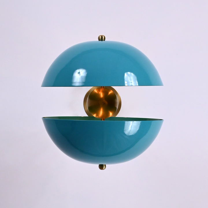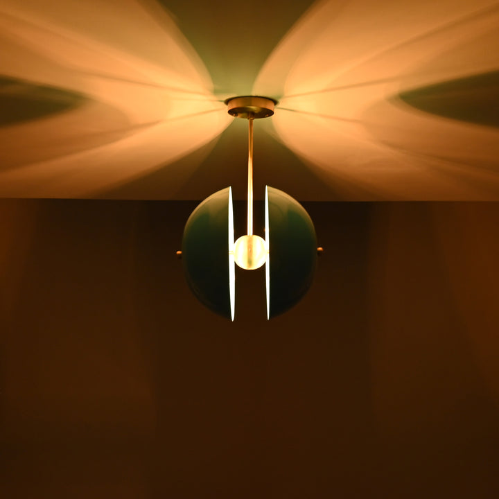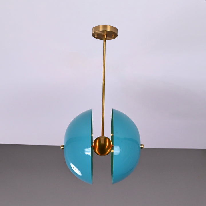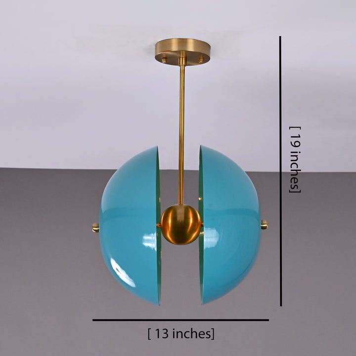 This pendant light features a distinctive spherical structure split into two symmetrical dome-shaped halves that enclose a central core. At its heart lies a fixture that supports six bulbs, strategically placed to maximize illumination. When lit in a dark room, the light dramatically escapes through the open sides, casting elegant, fan-like patterns across the ceiling and enhancing ambient warmth. Measuring 19 inches in height and 13 inches in diameter, its proportions make it a striking centerpiece for any contemporary or mid-century inspired space. The sleek rod suspension and minimal hardware create a floating effect, adding a sculptural element to the overall design.