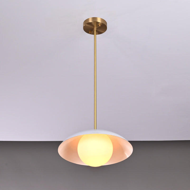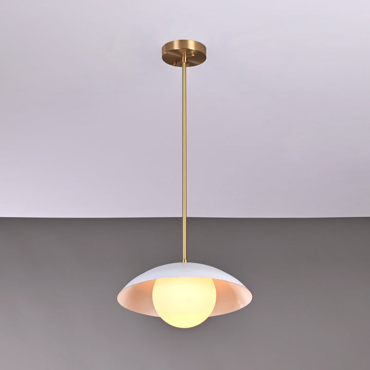 This modern pendant light features a sleek, minimalistic design with a semi-spherical shade that creates a striking visual presence from every angle. At the center, a smooth rounded diffuser is nestled within the shade, distributing light evenly for a soft and ambient glow. The internal globe enhances the overall light output, making it suitable for various settings such as dining areas, kitchens, or entryways. The pendant is supported by a streamlined brass rod structure that ensures a clean and stable suspension. With a diameter of 12 inches and a total height of 27 inches from ceiling to base, the fixture is well-proportioned for both single and grouped installations. Its sculptural form adds a touch of sophistication and modern elegance to any space.